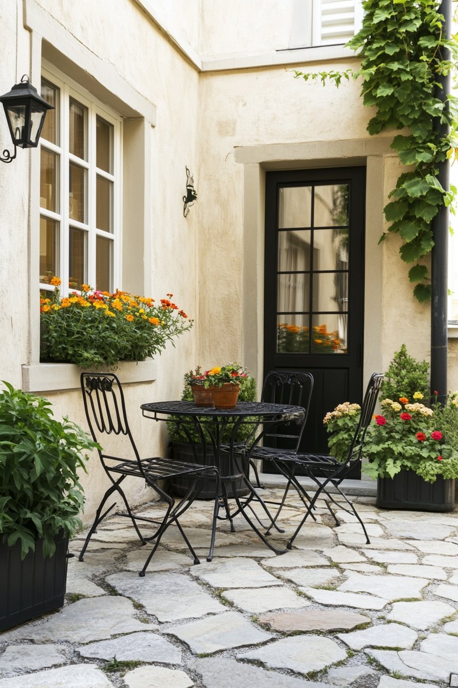 In this delightful urban courtyard, the charm lies in its harmonious blend of vibrant colors and textures, where cheerful marigolds and lush greenery create an inviting atmosphere. The black wrought-iron furniture adds a touch of elegance, perfectly contrasting with the warm, earthy tones of the surrounding walls, making it an ideal spot for relaxation.