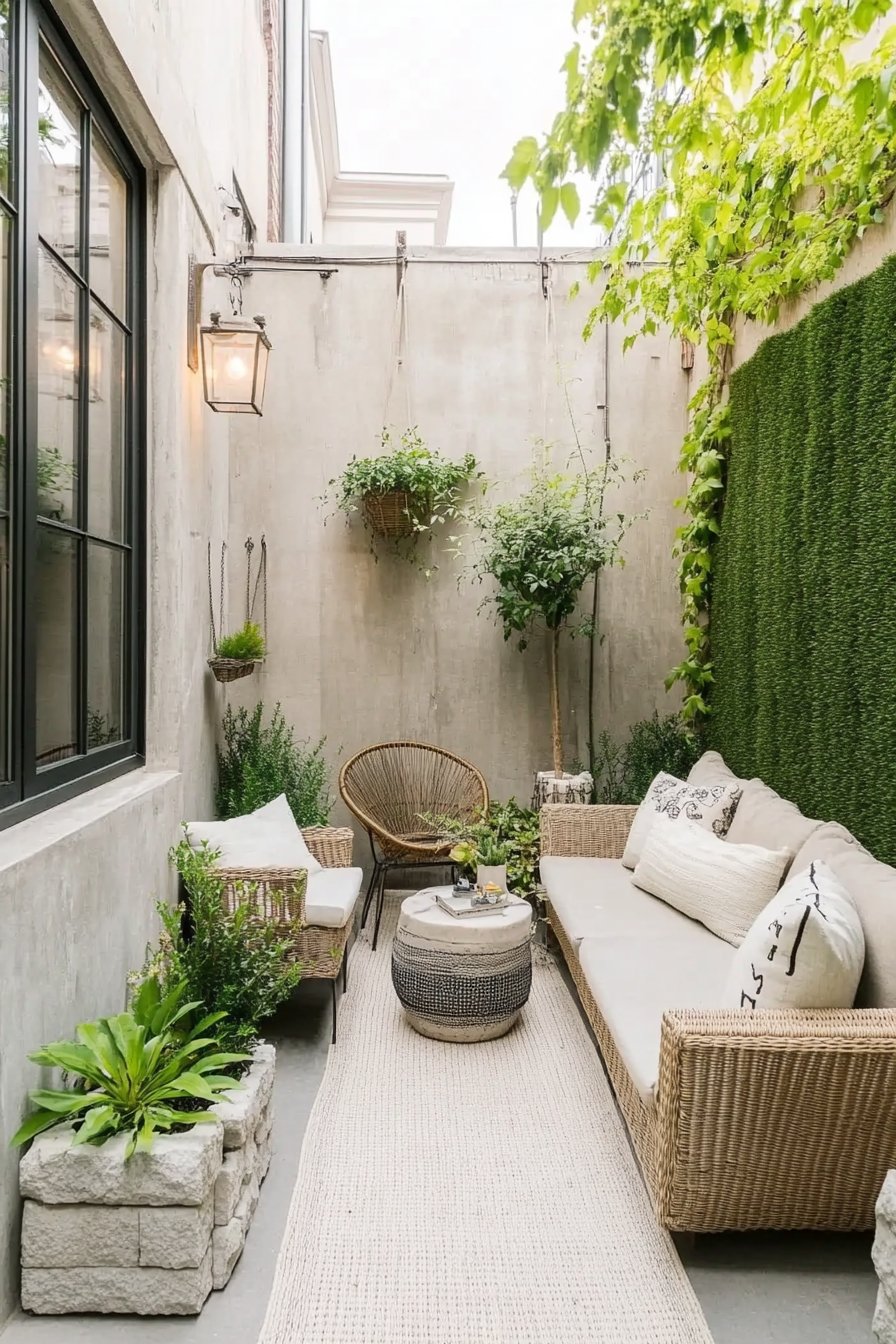 This design beautifully combines rustic charm with modern elegance, featuring lush greenery that softens the urban environment. The use of plants like ferns and climbing vines creates a serene backdrop, while the stylish rattan seating invites relaxation, making it the perfect cozy retreat.