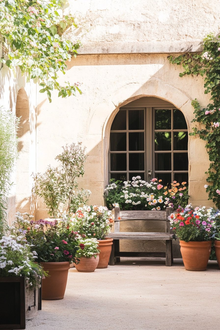 The charm of this courtyard oasis lies in its vibrant array of colorful blooms, combining cheerful geraniums, delicate petunias, and fragrant herbs that invite both the eye and the senses. The rustic wooden bench, surrounded by terracotta pots, creates an inviting space to relax and enjoy the warm sun, making it a perfect retreat.