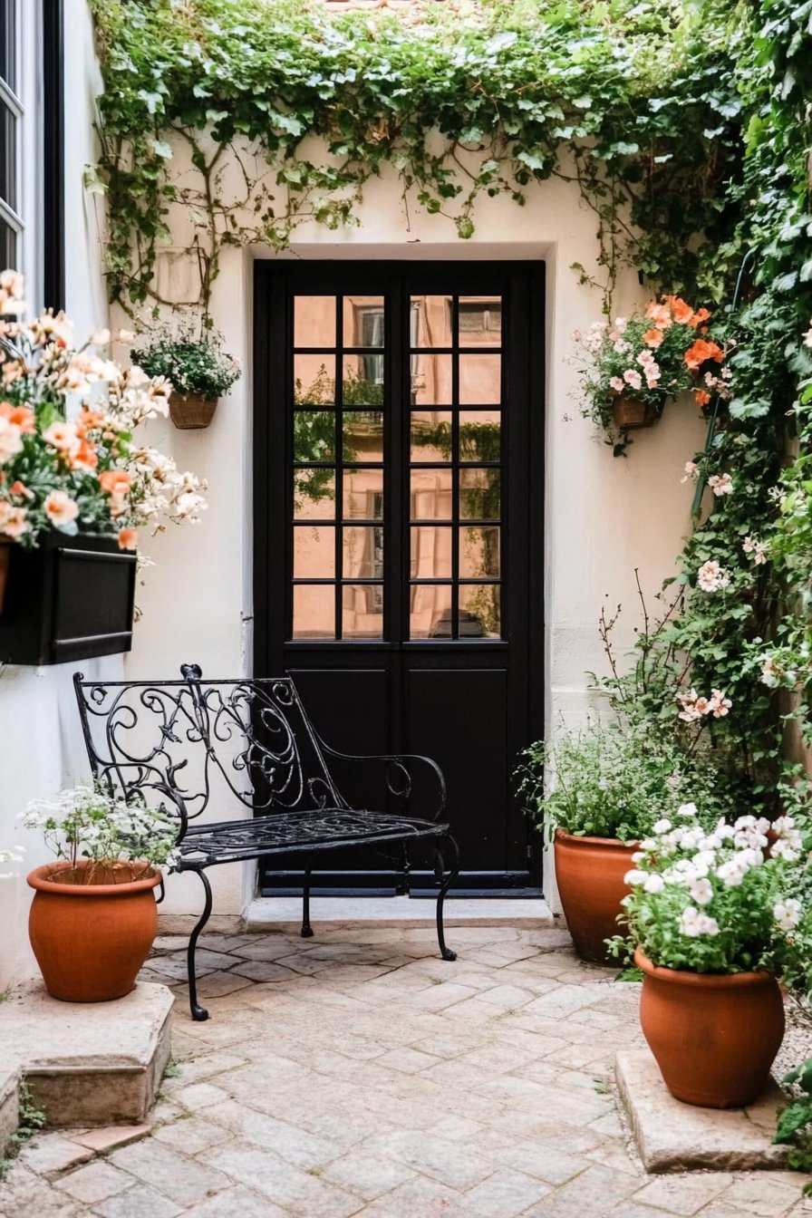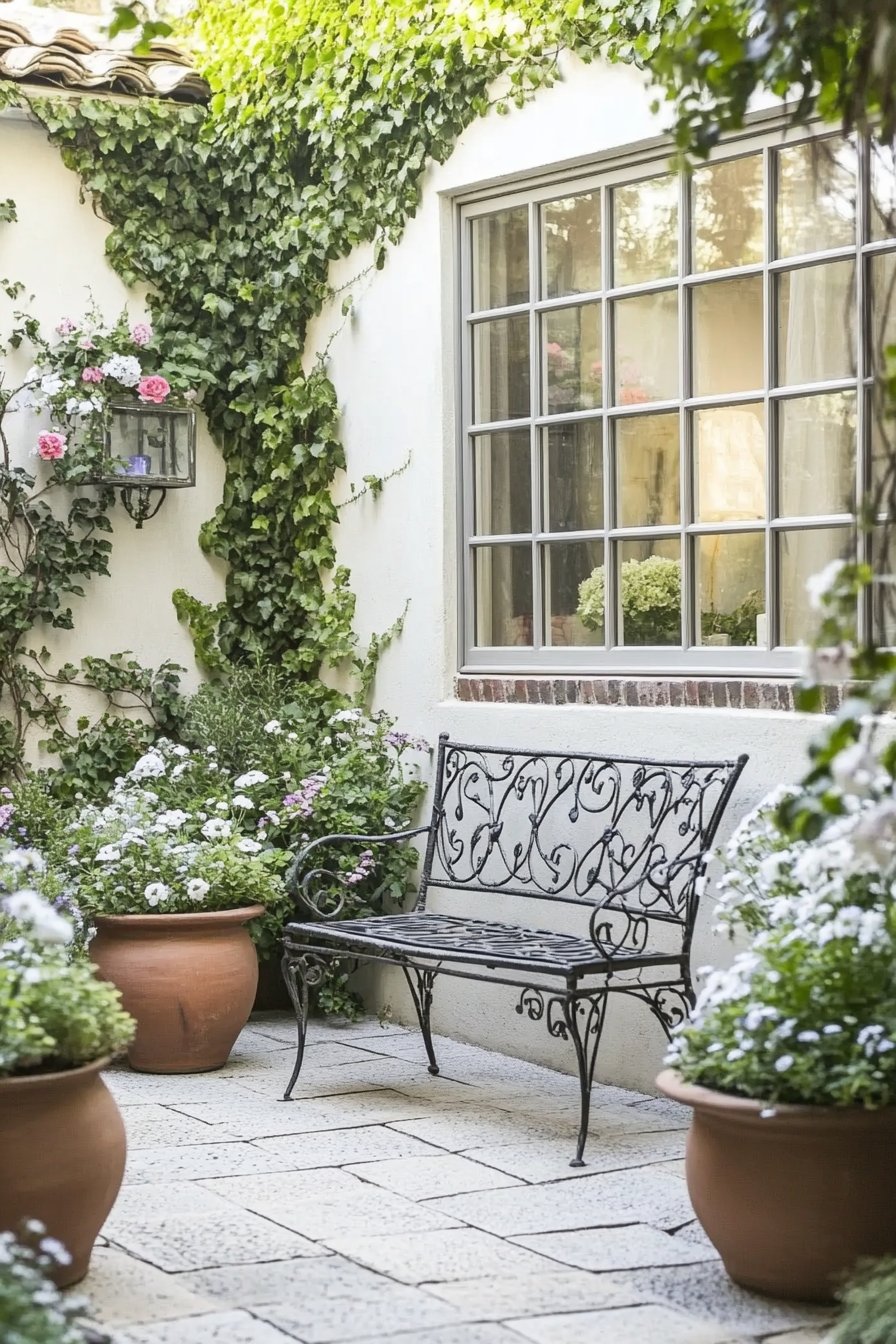 This charming courtyard beautifully combines vibrant blooms and lush greenery, creating a serene escape that feels both inviting and intimate. The terracotta pots bursting with geraniums in shades of pink and coral harmonize perfectly with the climbing ivy, while the wrought-iron bench invites you to sit and soak in the tranquil atmosphere.
