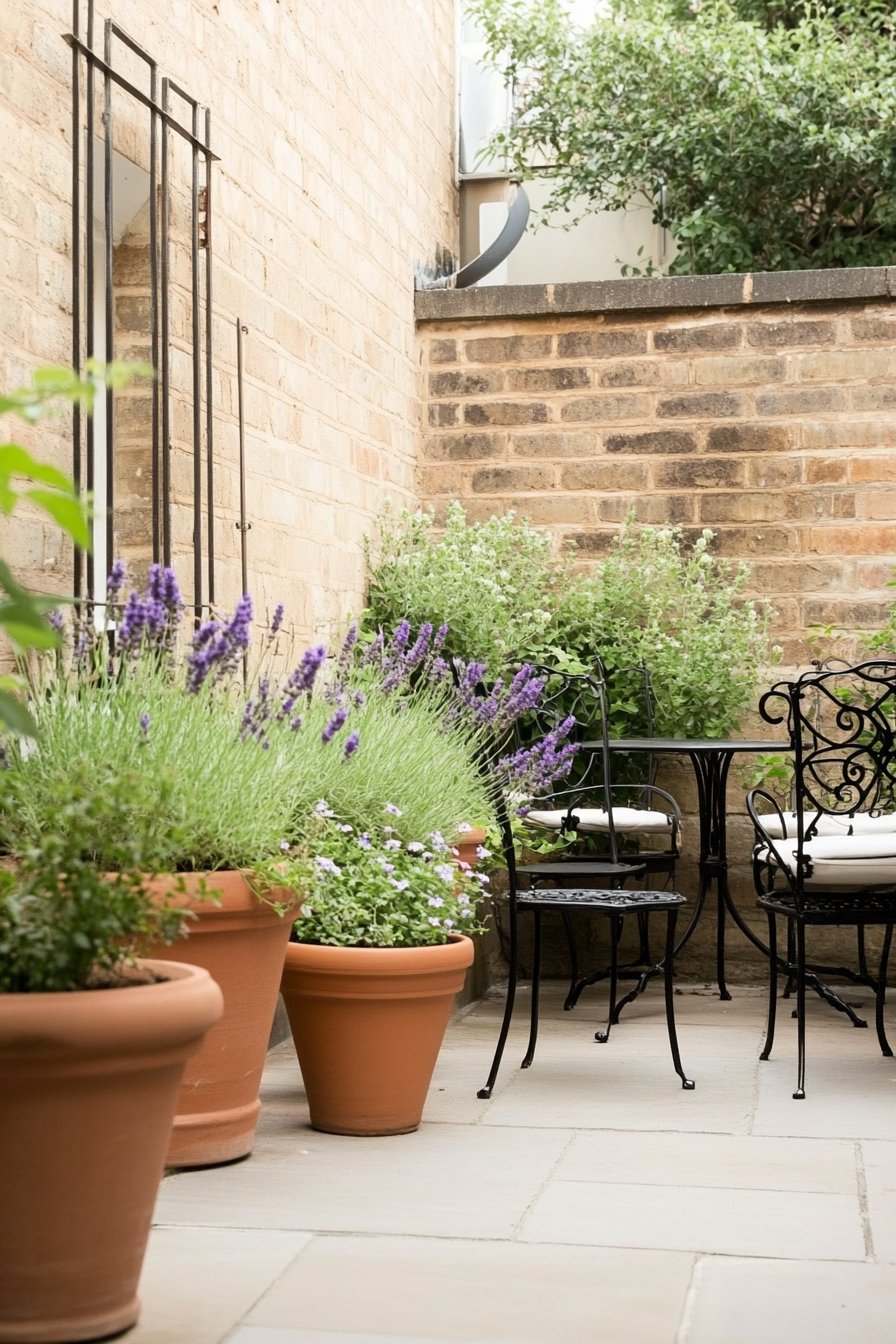 The charming design features a delightful mix of potted lavender and trailing flowers, creating a vibrant yet soothing atmosphere that invites relaxation. The terracotta pots contrast beautifully with the lush greenery, while the intricate black metal furniture adds a touch of elegance, making it the perfect spot for sipping morning coffee or enjoying evening gatherings.