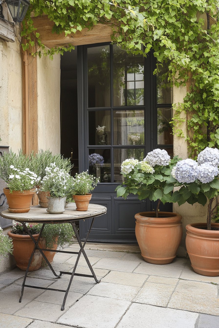 The charming blend of terracotta pots and lush greenery creates an inviting atmosphere that feels both rustic and sophisticated. I adore the combination of lavender and delicate , which not only add texture but also infuse the space with delightful fragrances, while the soft blue hydrangeas provide a stunning focal point.