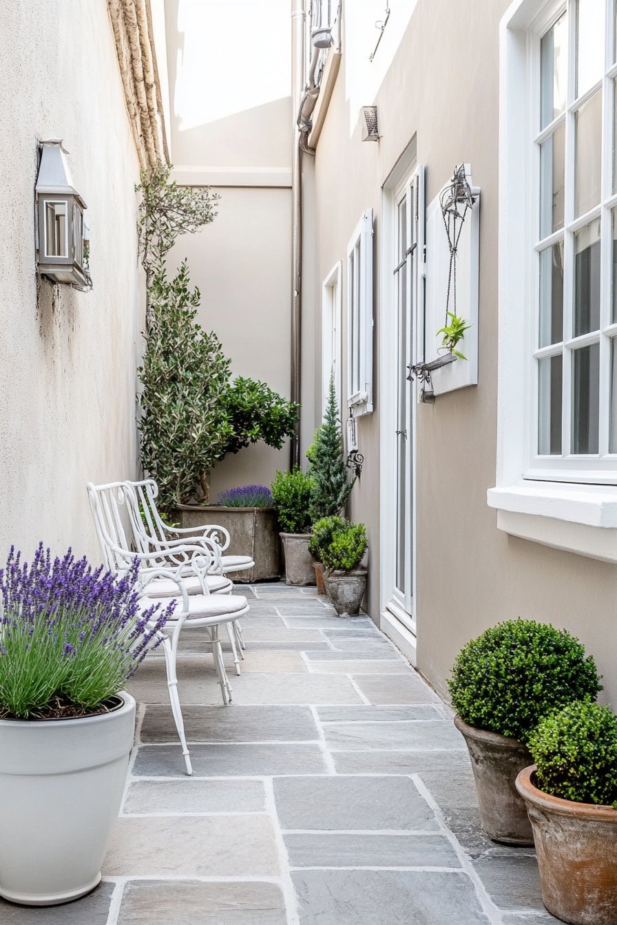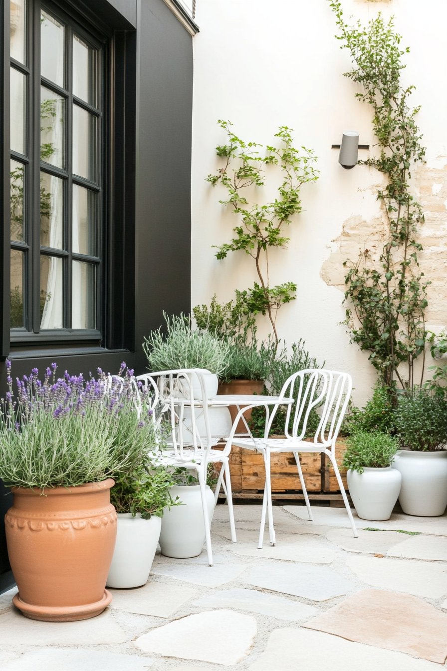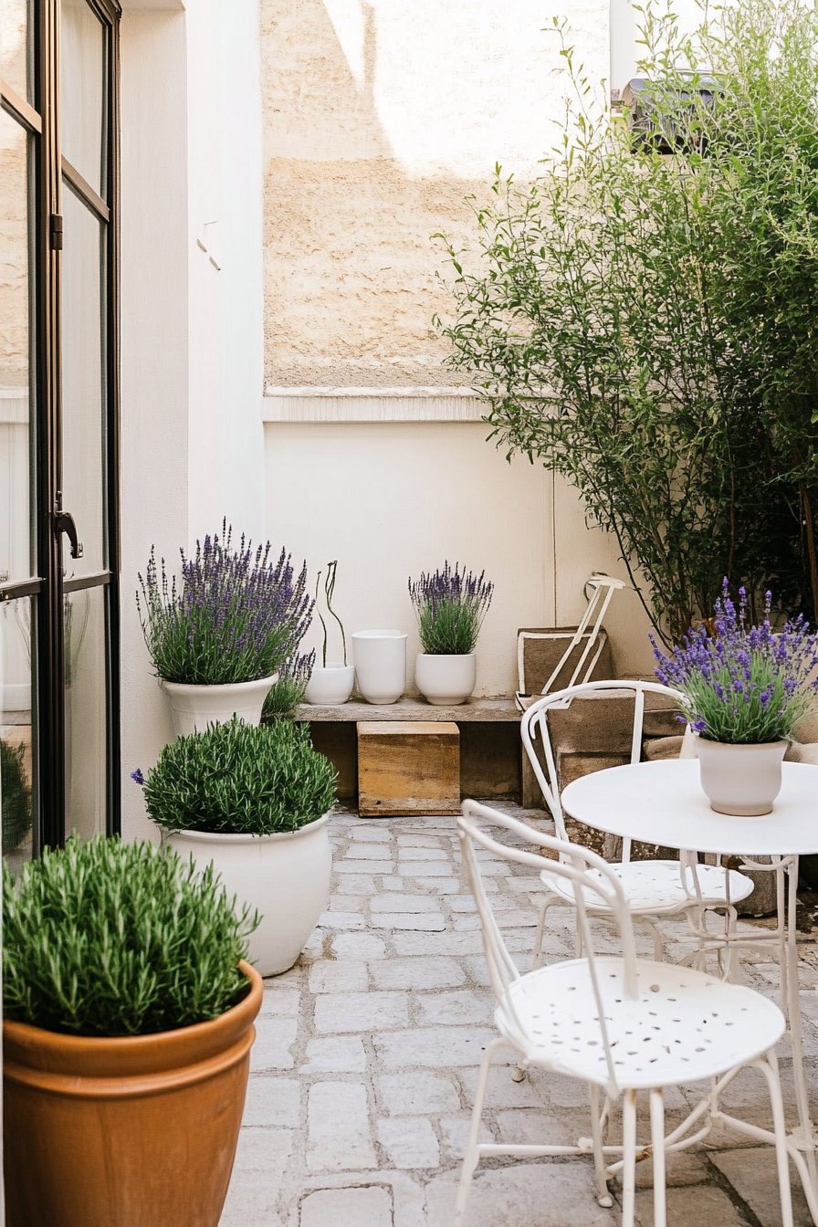 To achieve a similar look, consider using terracotta and white planters to house your lavender and other low-maintenance herbs like rosemary or thyme, which thrive in sunny spots. Incorporating a small, bistro-style table and chairs will invite you to savor the tranquil ambiance while maximizing your outdoor space, no matter how compact.