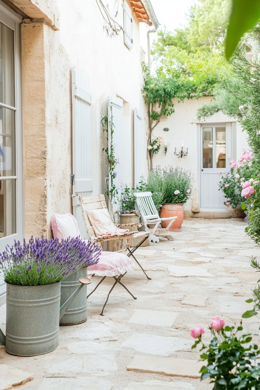 To replicate this enchanting look at home, consider planting lavender in various pots to add height and texture, while incorporating white or light-colored furniture for a fresh, airy feel. Don’t forget to include a few decorative elements, like woven baskets or small flowering plants, to enhance the cozy ambiance.