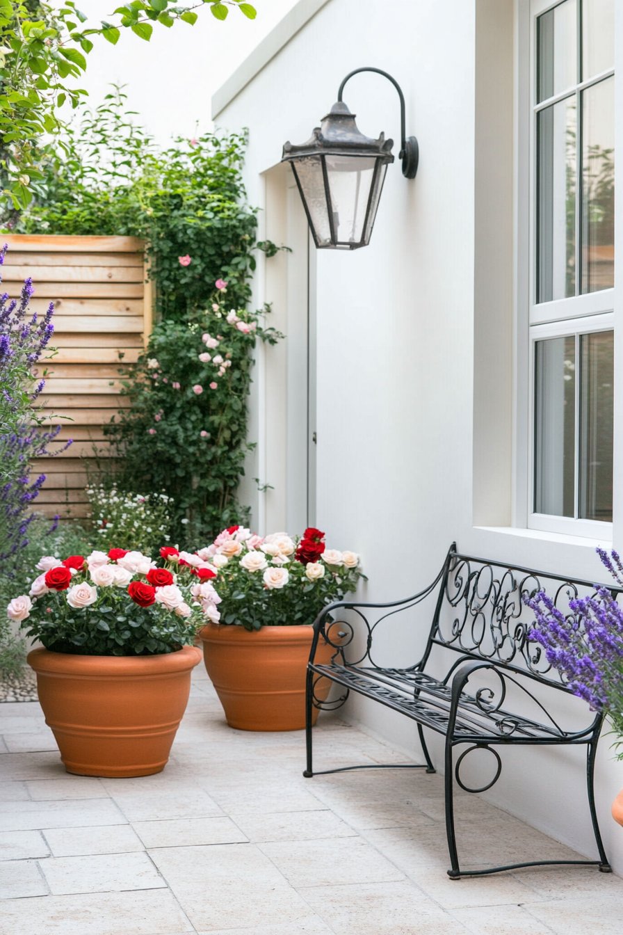 This garden design captivates with its harmonious blend of vibrant roses in shades of red and soft pink, nestled in terracotta pots that add warmth to the space. The elegant black wrought iron bench invites relaxation, while fragrant lavender and lush greenery provide a serene backdrop, creating an enchanting sanctuary.