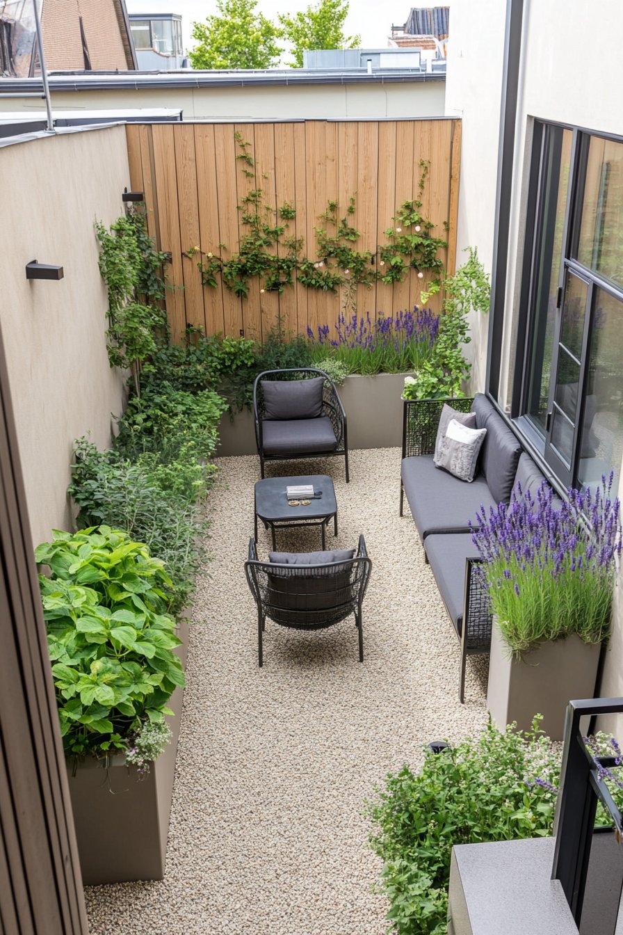 I absolutely adore the way this garden design blends rustic charm with urban sophistication, creating a serene retreat right in the heart of the city. The lush greenery, including trailing vines and aromatic herbs like lavender and rosemary, not only adds texture and fragrance but also invites a sense of tranquility, while the warm stone planters provide a perfect balance between nature and structure.