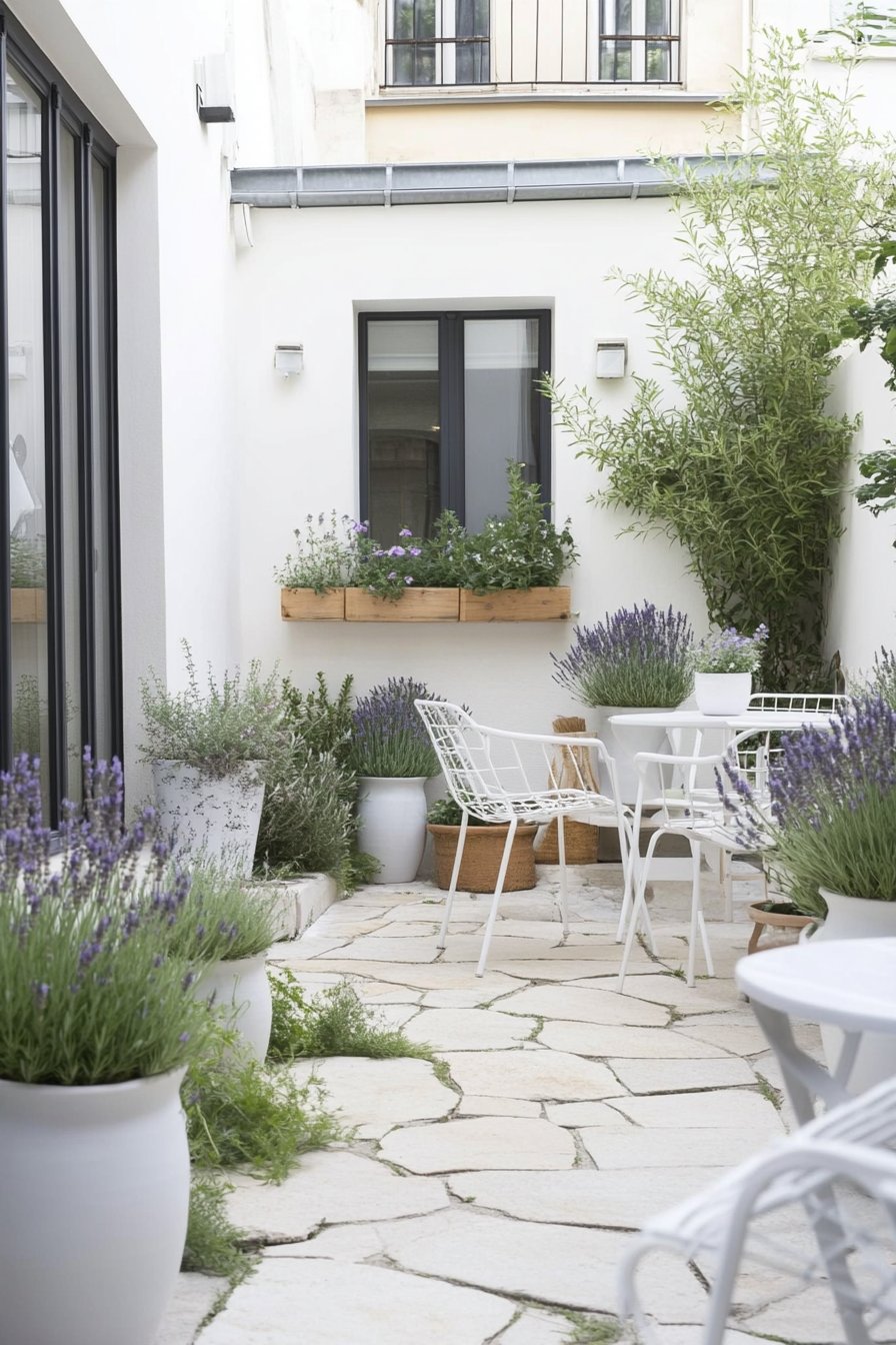 This garden design captivates with its soothing palette of soft greens and vibrant purples, primarily featuring lush lavender in various pots that create a fragrant, relaxing atmosphere. The combination of sleek white furniture against the rustic stone pavement enhances the urban oasis feel, making it an ideal retreat for enjoying morning coffee or evening gatherings.