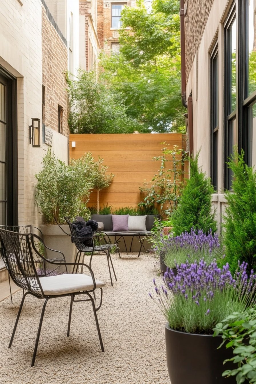 This garden design captivates with its harmonious blend of textures and colors, featuring lush lavender that adds a delightful fragrance and vibrant purple hues against the serene backdrop of soft greys and warm wood tones. The thoughtful arrangement of evergreen shrubs provides year-round structure, while the cozy seating area invites relaxation amidst the urban hustle.