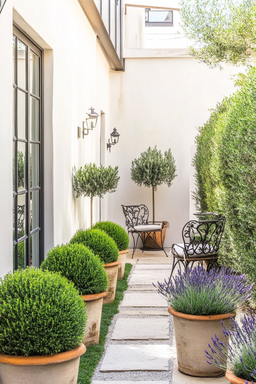 This garden design beautifully captures the essence of Mediterranean charm with its lush green boxwood spheres and aromatic lavender, creating a serene retreat that invites relaxation. The interplay of soft earth tones in the terracotta pots and the elegant wrought iron seating perfectly complements the vibrant greenery, making it a delightful space to unwind.