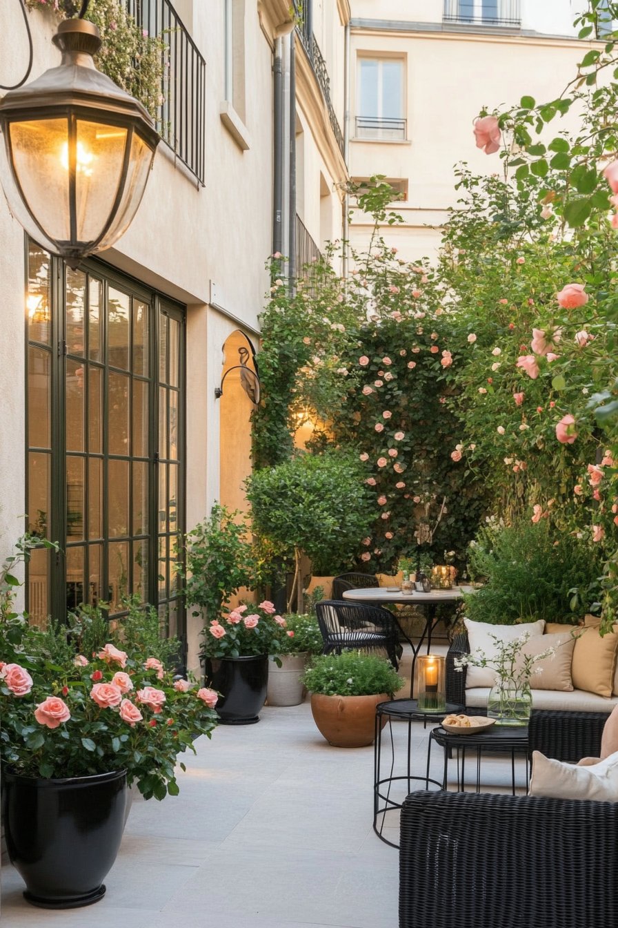 To recreate this look at home, consider using potted climbing roses and a variety of perennial plants for year-round interest. Incorporate structured elements like topiary for a polished feel, and arrange comfortable seating to encourage enjoying your personal oasis.