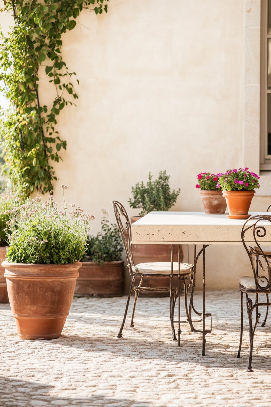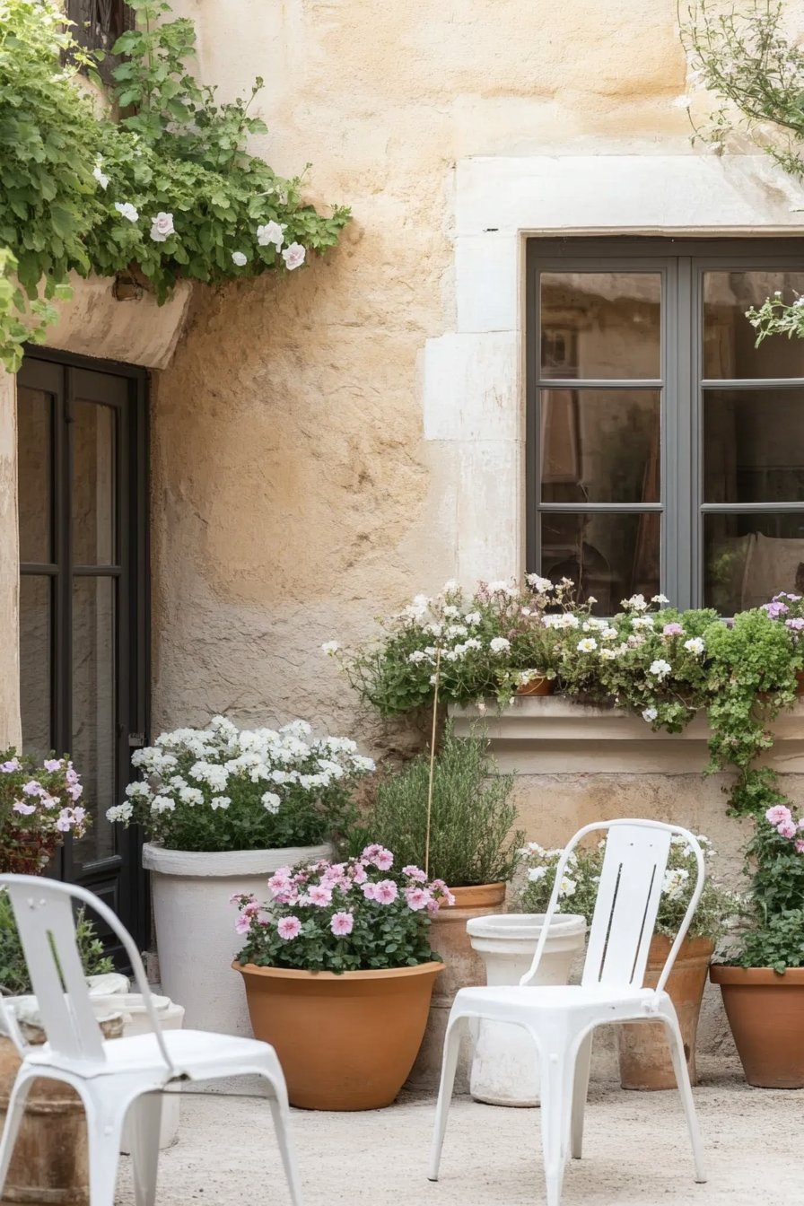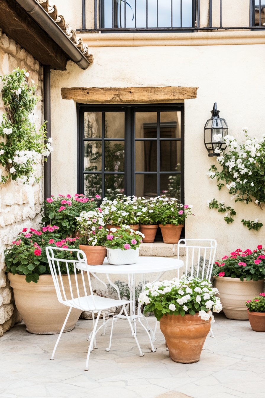 To achieve this look at home, consider using a mix of white and pink geraniums for a pop of color, and incorporate rustic terracotta pots for an authentic touch. Don’t forget to add a small bistro table and chairs to create an inviting spot for morning coffee or evening chats, enhancing your outdoor space’s charm and functionality.