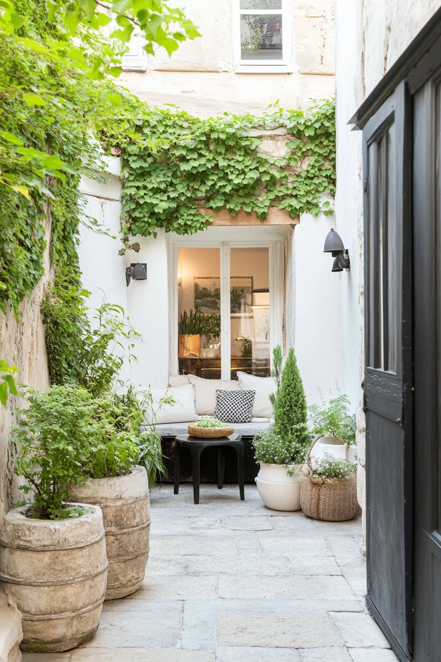 To achieve a similar look at home, consider using climbing plants to soften walls and create a cozy atmosphere, alongside stylish seating that encourages relaxation. Incorporating a mix of herbs and decorative plants in natural stone or terracotta pots will help you cultivate that inviting retreat feel, making your outdoor space a true oasis.
