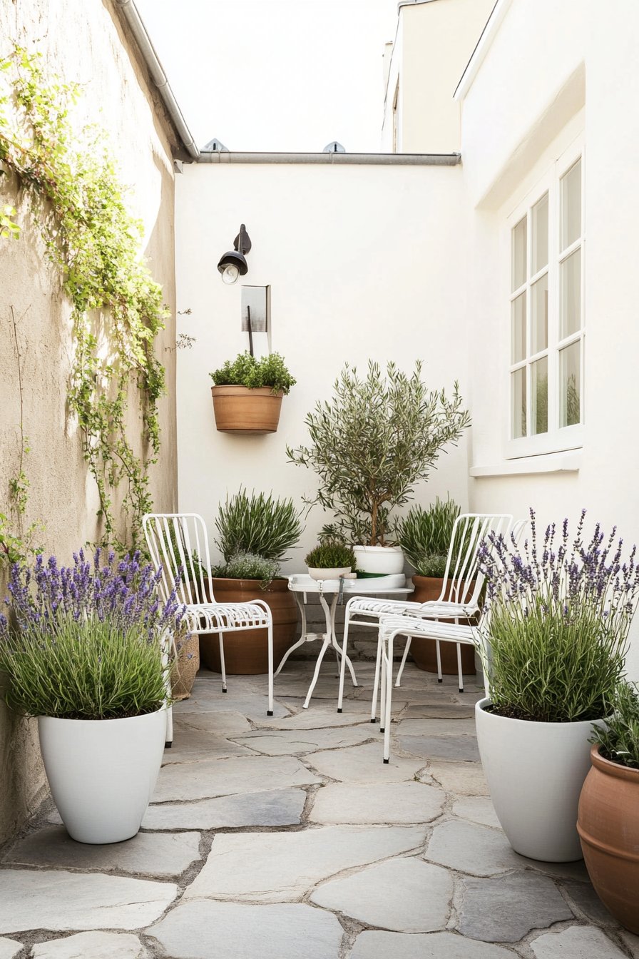 I absolutely adore the serene ambiance created by the combination of soft lavender and lush greenery, perfect for a Mediterranean-inspired retreat. The use of terracotta pots adds warmth, while the white metal furniture offers a chic contrast, inviting you to relax and unwind in this tranquil space.