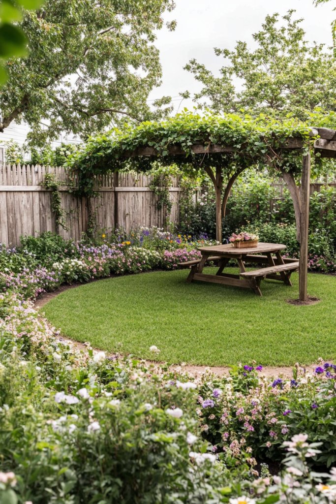 A cozy country-style garden centered around a circular lawn, framed by weathered wooden fencing and overflowing flower borders. A rustic picnic table sits beneath a vine-draped pergola, creating an inviting space for outdoor gatherings. Pair with galvanized planters, a wooden wheelbarrow, and soft linen cushions for added charm.