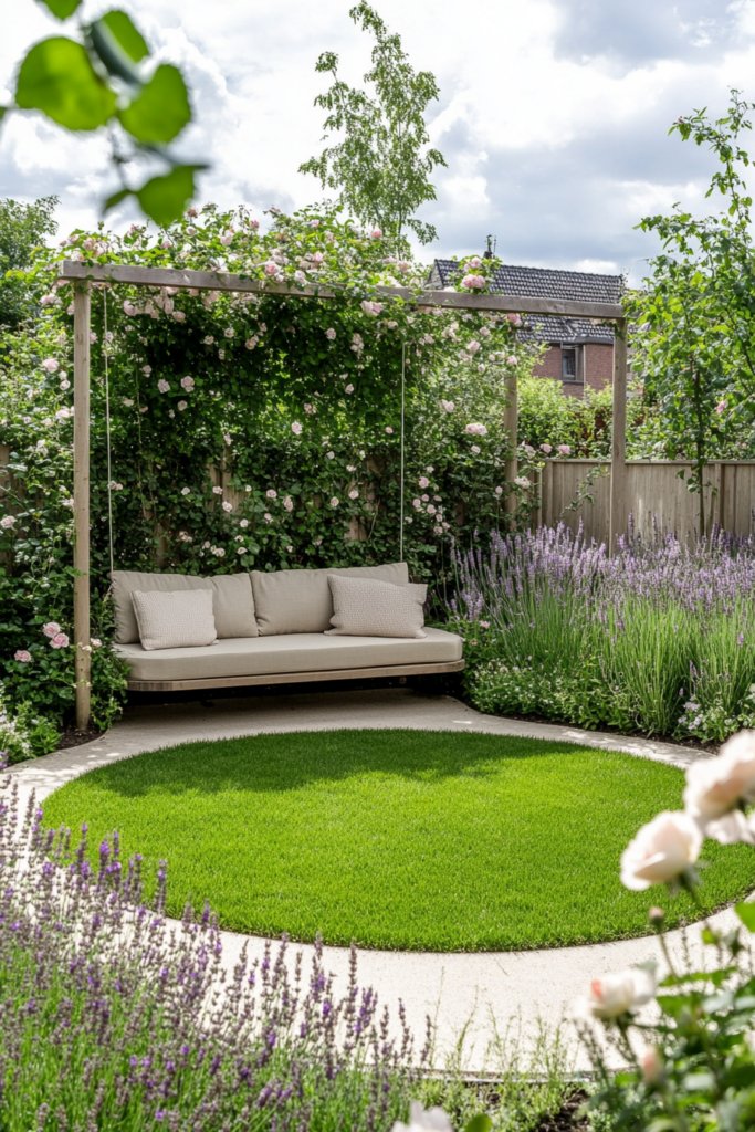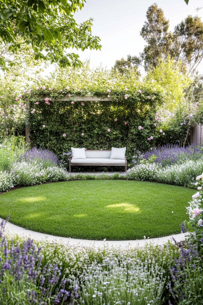 A peaceful garden retreat where a circular lawn is enclosed by soft grasses, lavender, and climbing roses. A shaded bench provides a cozy spot for relaxation. Surround the space with tall hedges, delicate fairy lights, and a trickling fountain for ultimate serenity.