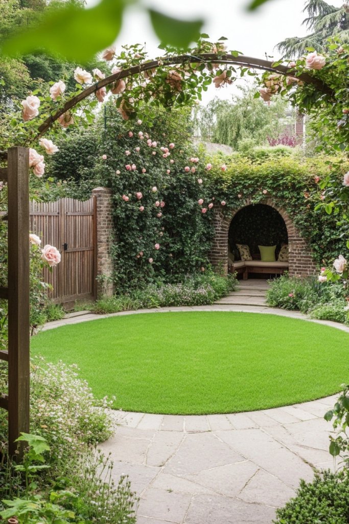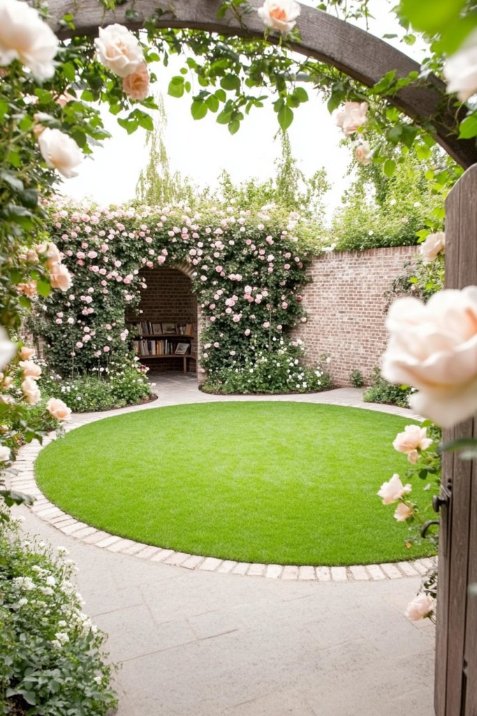 A hidden oasis where a perfectly round lawn is enclosed by an old brick wall covered in climbing roses. A rustic wooden gate opens to winding stone pathways that lead to a tucked-away reading nook. Enhance the secluded charm with antique planters, ivy-draped trellises, and vintage-inspired lighting.