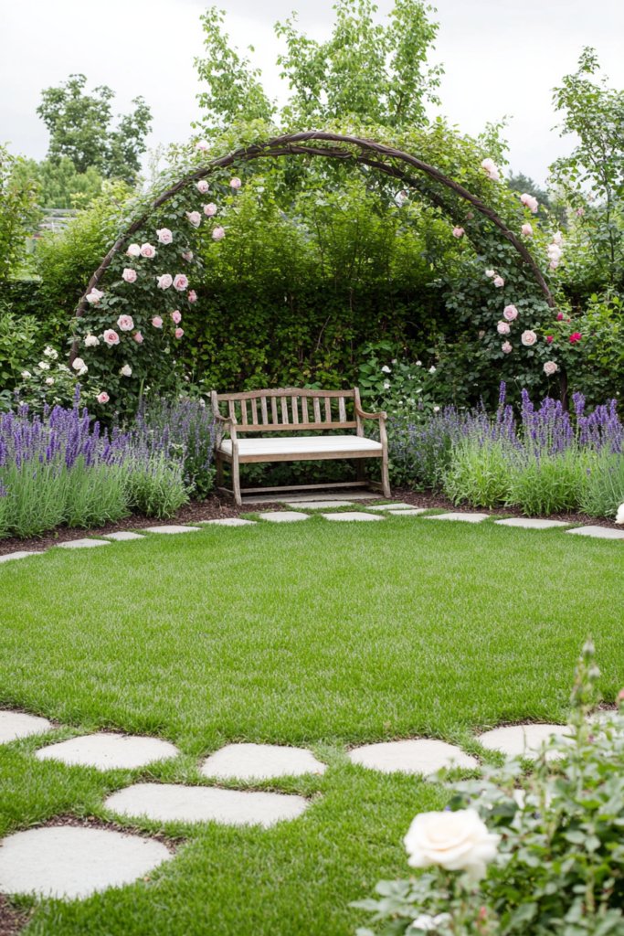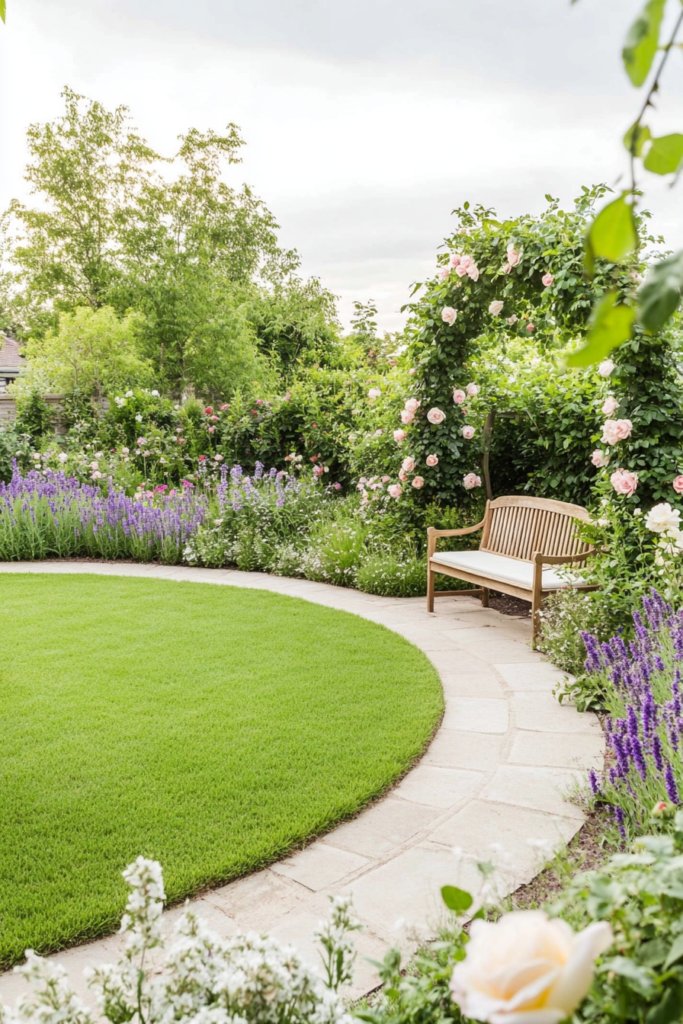 A lush, inviting circular lawn is surrounded by winding stone pathways, overflowing borders of lavender, foxgloves, and . A vintage wooden bench sits beneath an archway of climbing roses, creating a dreamy, nostalgic escape. Add antique garden tools, rustic trellises, and weathered planters to complete the look.