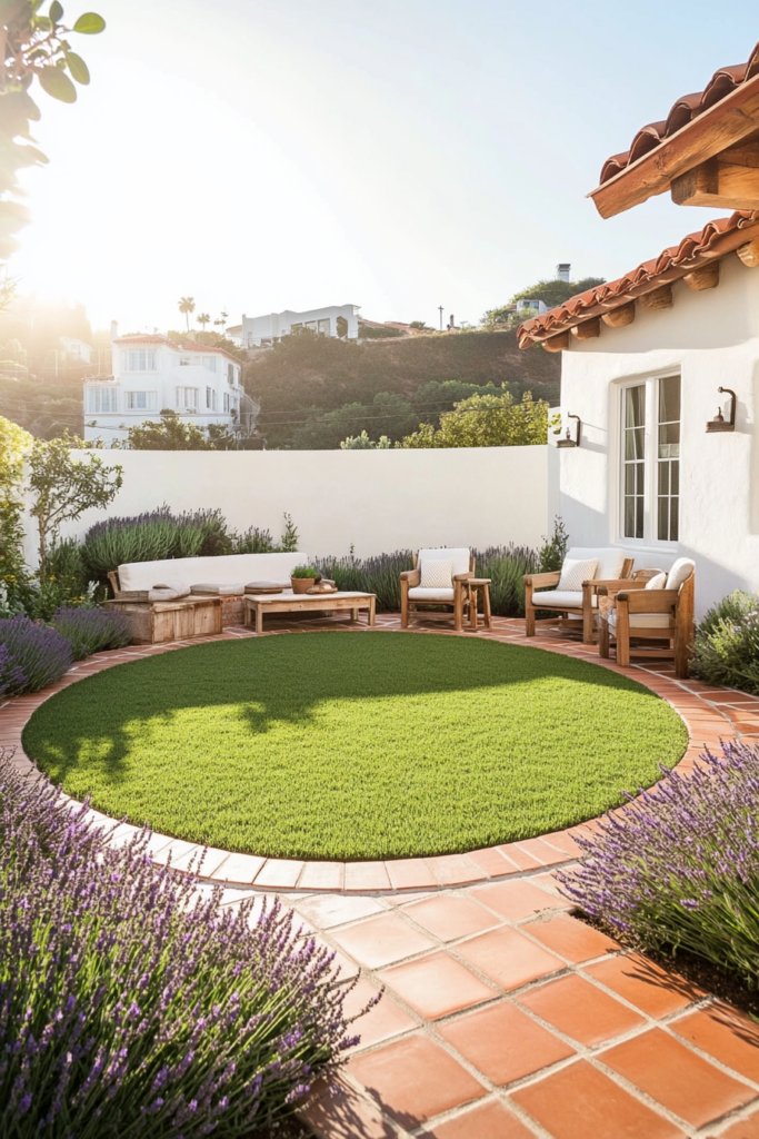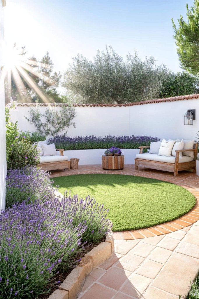 A sun-drenched circular lawn bordered by terracotta tiles, lavender, and rosemary, evoking a seaside escape. Whitewashed walls and rustic wooden furniture enhance the breezy aesthetic. Complete the look with woven lanterns, ceramic pottery, and a shaded pergola draped in climbing vines.
