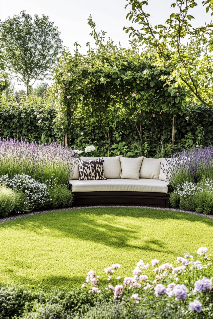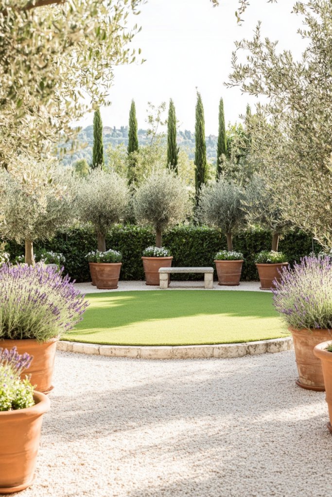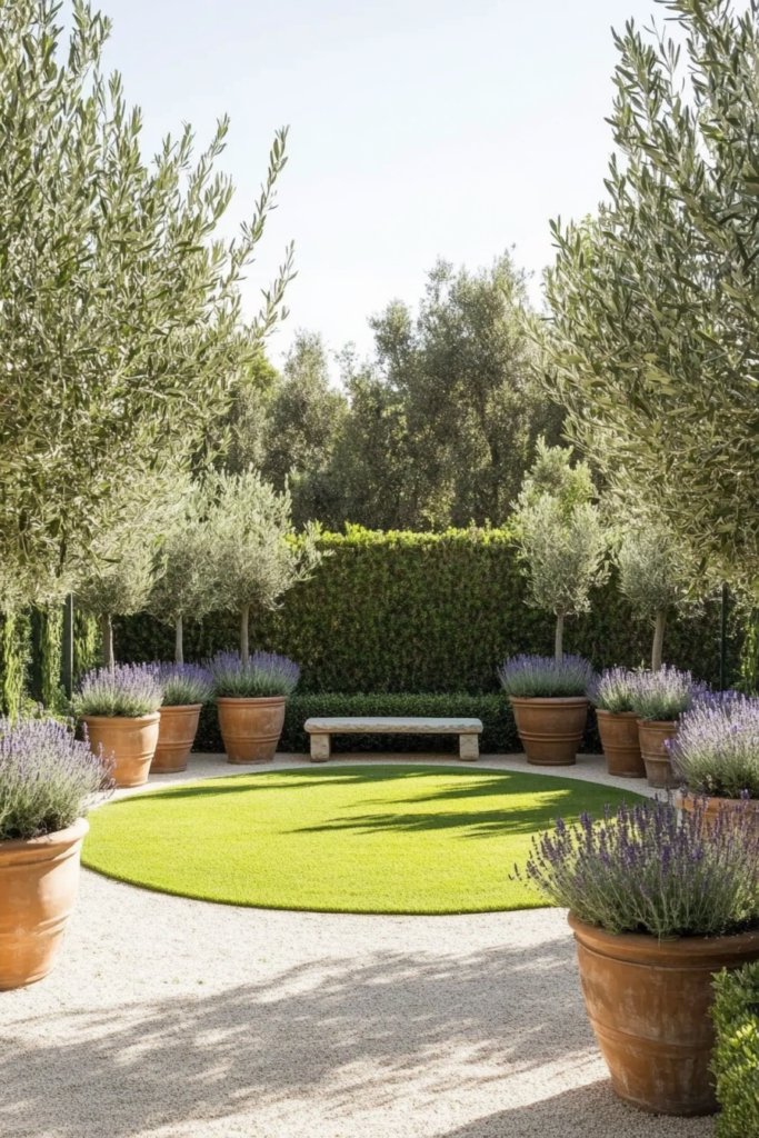 A Mediterranean-inspired garden where a perfectly round lawn is framed by terracotta pots filled with olive trees and fragrant lavender. A stone bench rests under a cypress-lined pathway, evoking the romance of the Italian countryside. Incorporate decorative urns, a gravel walkway, and wrought-iron details for timeless elegance.