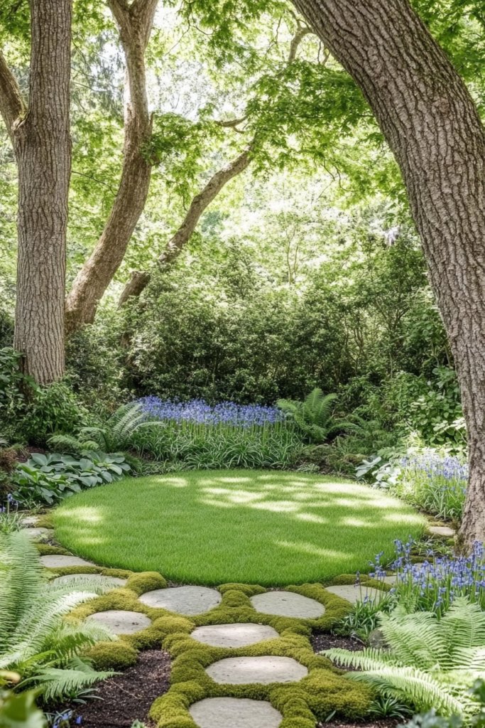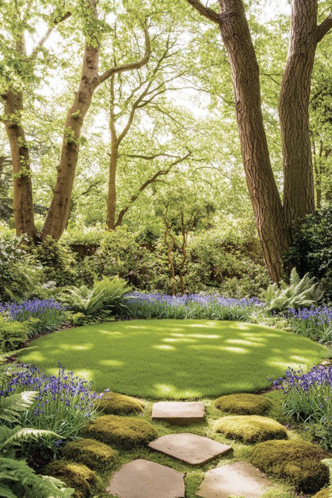 A magical woodland retreat featuring a dappled circular lawn beneath ancient oak trees, surrounded by ferns, bluebells, and moss-covered stepping stones. The soft, shaded atmosphere is perfect for a cozy wooden bench, hidden pathways, and fairy lights twinkling through the trees.