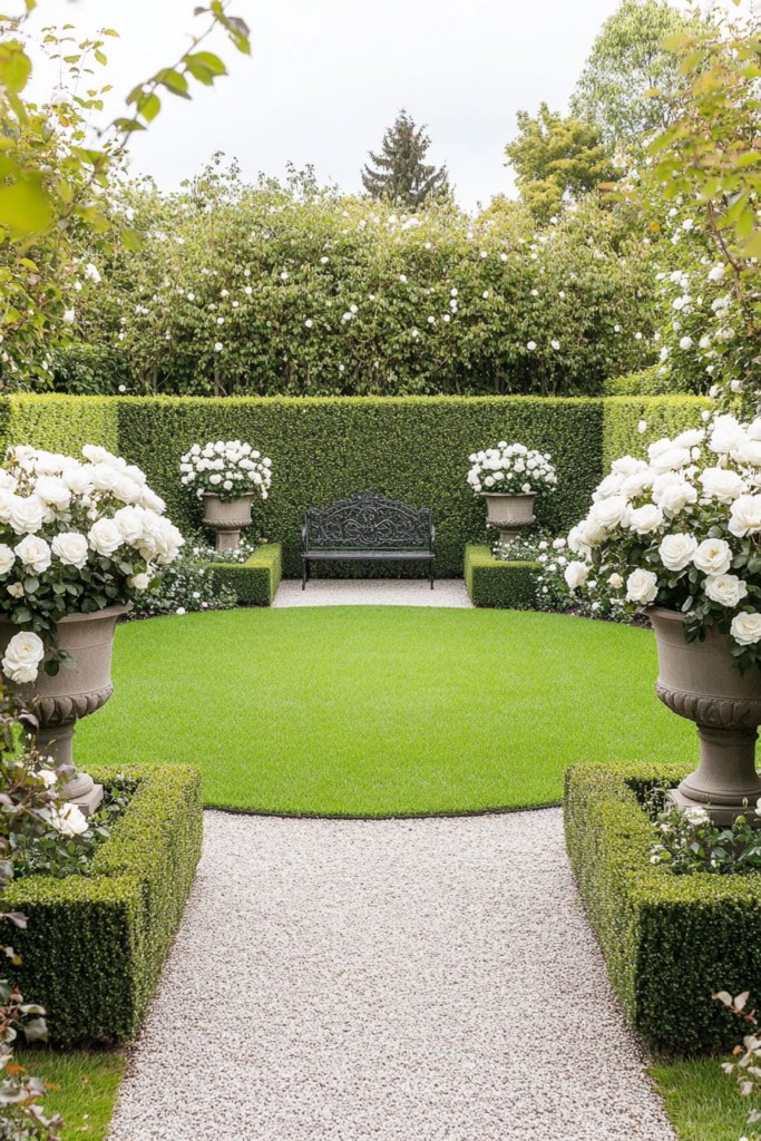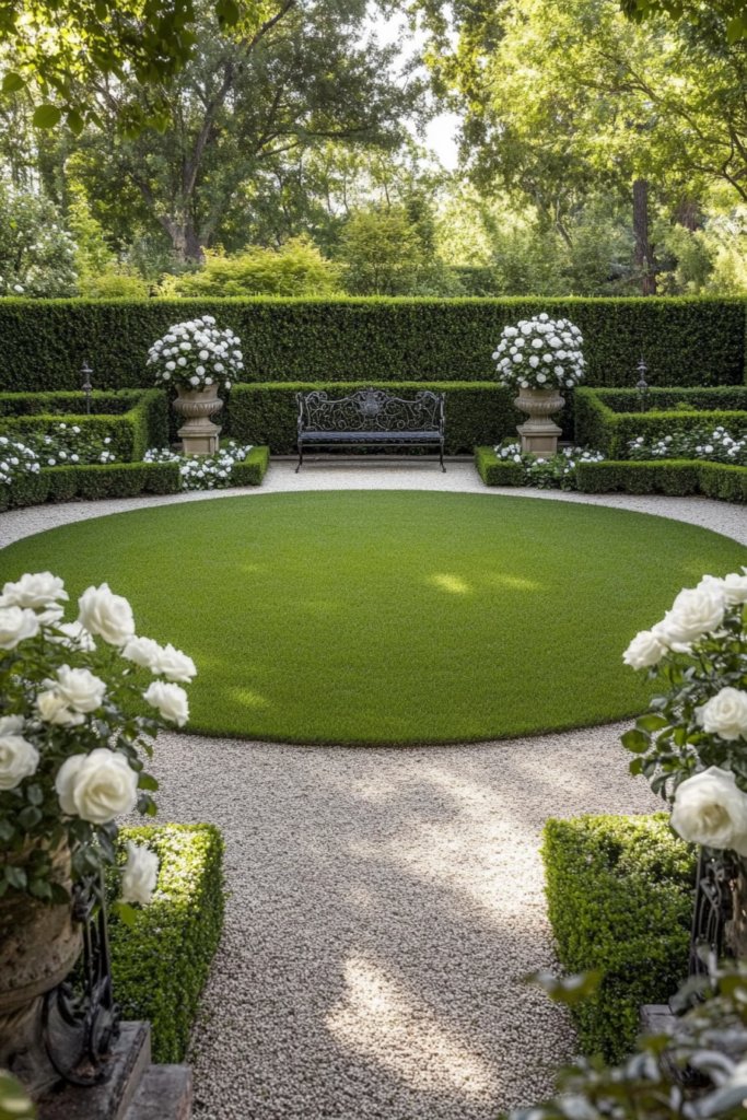A perfectly symmetrical circular lawn is framed by neatly clipped boxwood hedges, classical urns filled with white roses, and a gravel pathway leading to a cast-iron bench. This refined garden exudes old-world elegance. Add ornate statues, wrought-iron fencing, and a central water fountain for a grand Victorian touch.