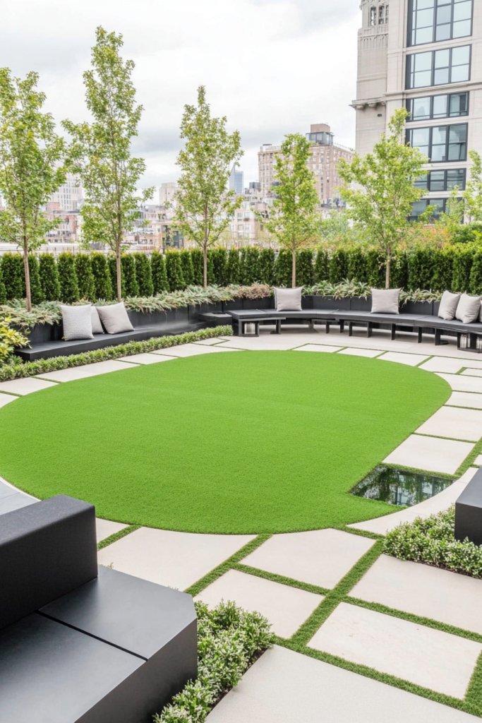A bold, structured landscape with a geometric layout, featuring a circular lawn bordered by large square stepping stones and a reflective pool. Sleek black outdoor seating enhances the modern elegance. Add architectural plants, LED lighting, and polished stone surfaces for a cutting-edge design.