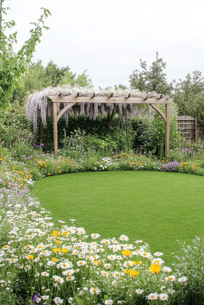A relaxed, informal garden where a circular lawn is surrounded by lush wildflowers like daisies, poppies, and cornflowers. A rustic wooden pergola covered in wisteria completes the whimsical aesthetic. Add wooden swings, woven baskets, and repurposed stone pathways for a fairytale-inspired atmosphere.
