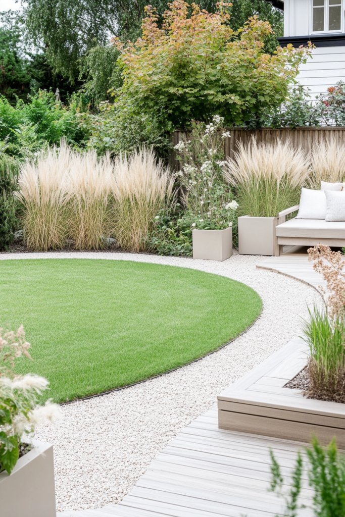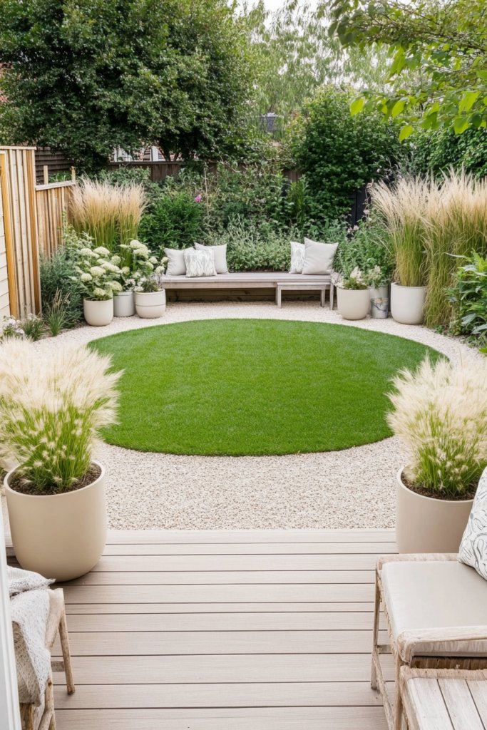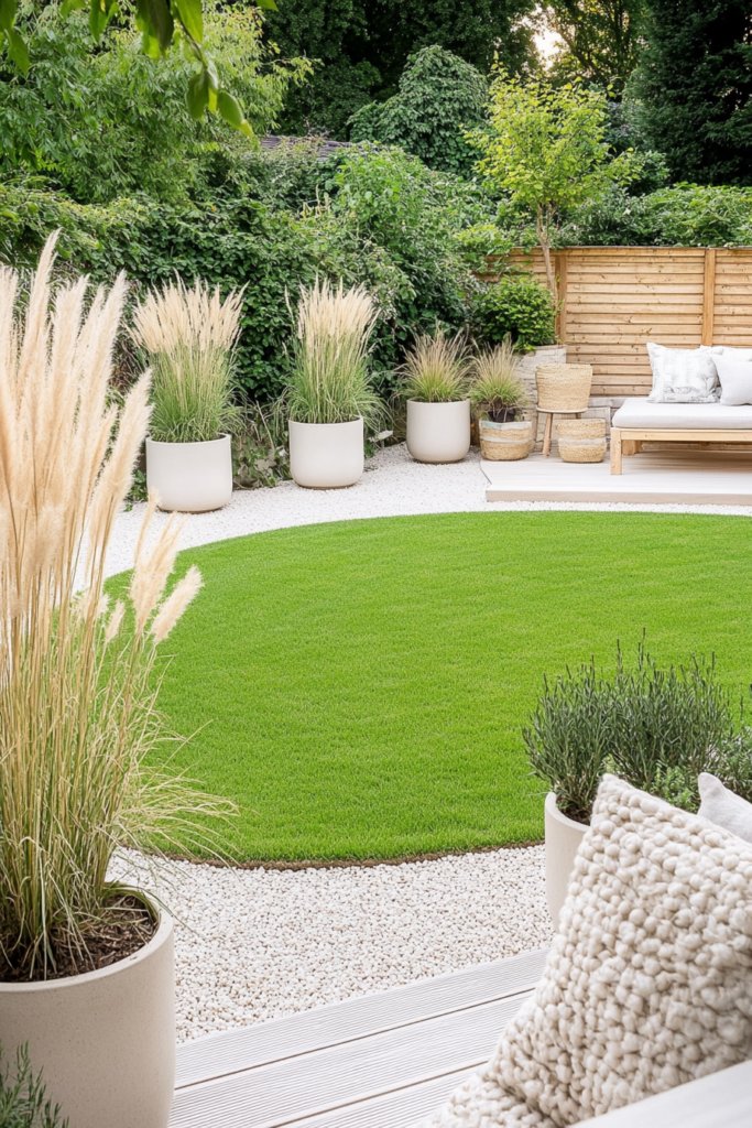 A serene outdoor retreat where a perfectly edged circular lawn is framed by pale gravel walkways, neutral-toned planters, and soft ornamental grasses. A simple wooden deck provides an understated seating area. Use natural materials, sleek furniture, and soft lighting to enhance the minimalist aesthetic.