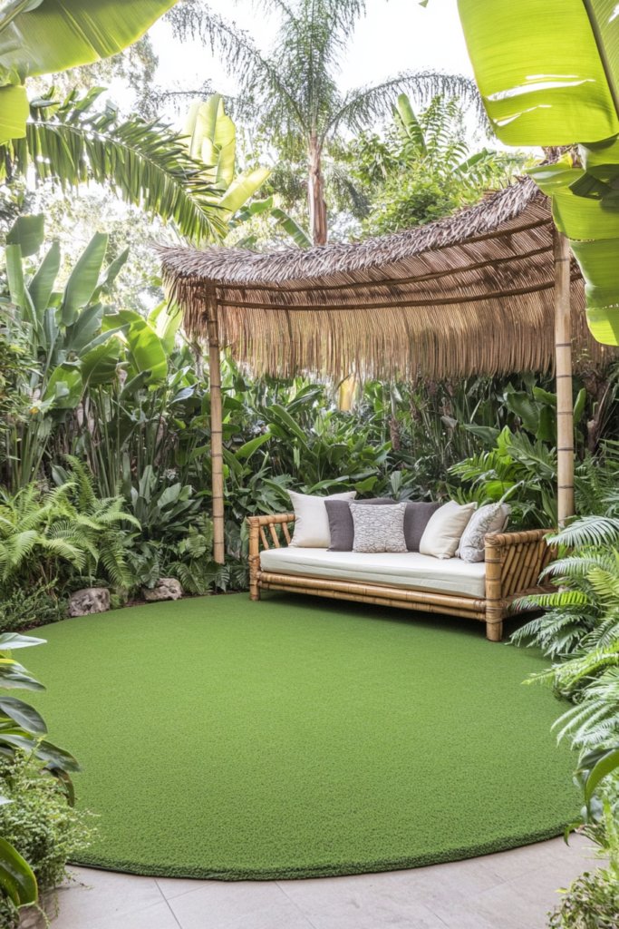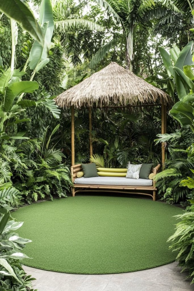 A tropical oasis where a vibrant green circular lawn is surrounded by dense foliage, ferns, and banana plants. A bamboo daybed shaded by a thatched canopy creates a secluded hideaway. Add tiki torches, stone pathways, and carved wooden accents to heighten the jungle retreat feel.