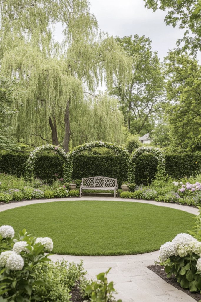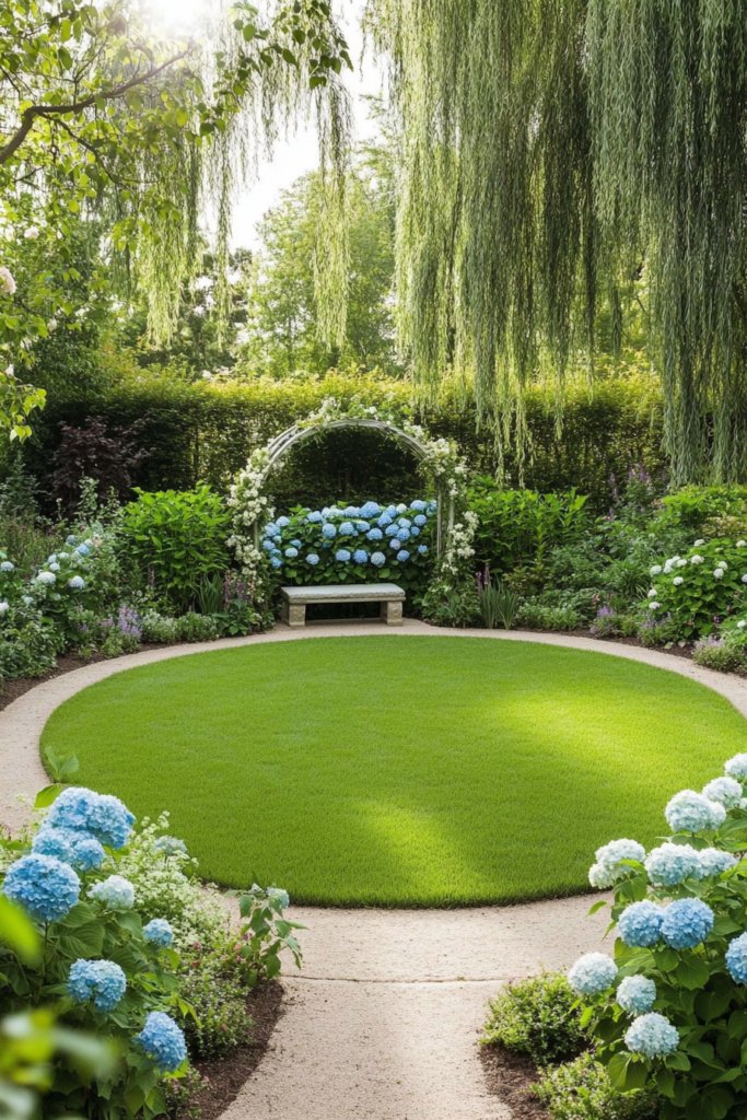 A storybook-inspired garden with a perfectly round lawn framed by meandering paths, flowering arches, and oversized hydrangea bushes. A charming stone bench sits beneath a graceful willow tree, enhancing the enchanted ambiance. Complete the setting with whimsical lanterns, rustic trellises, and soft pastel floral arrangements.