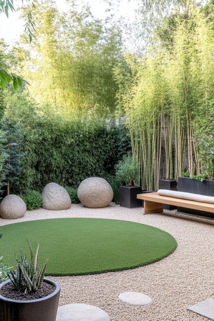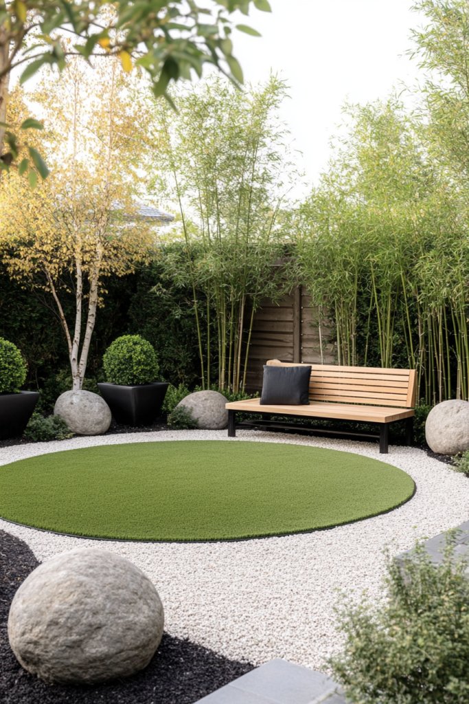 A tranquil, balanced garden where a smooth circular lawn is framed by a gravel path, sculptural boulders, and bamboo planters. A contemporary teak bench offers a peaceful resting spot. Add a koi pond, raked gravel sections, and stone lanterns for a meditative atmosphere.
