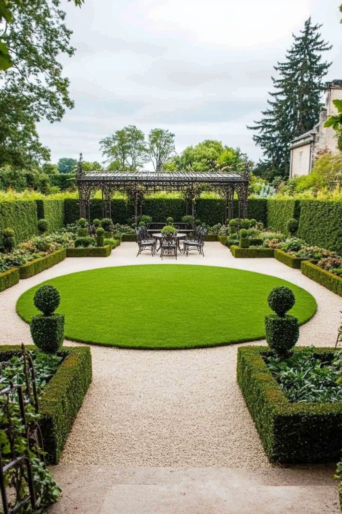 A refined and structured garden featuring a central circular lawn bordered by low hedges, intricate gravel paths, and sculpted topiaries. A wrought-iron dining set beneath an ornate pergola offers an elegant space for al fresco dining. Add symmetrical flower beds, classic urn planters, and delicate fountains for true French charm.