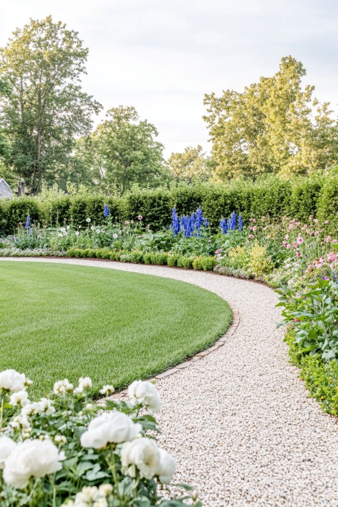 A soft circular lawn is gently framed by swaying wildflowers, rustic wooden stepping stones, and winding gravel paths. This natural, unstructured setting blends seamlessly with the surrounding countryside. Add a weathered wooden gate, repurposed barrels for planters, and a cozy hammock for ultimate relaxation.