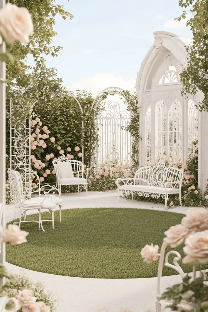 A soft, romantic garden with a slightly overgrown circular lawn framed by rambling roses, ivy-draped archways, and pastel flower beds. Vintage white metal furniture adds a nostalgic charm. Pair with distressed wooden accents, lace curtains, and floral-print cushions for a dreamy shabby chic retreat.