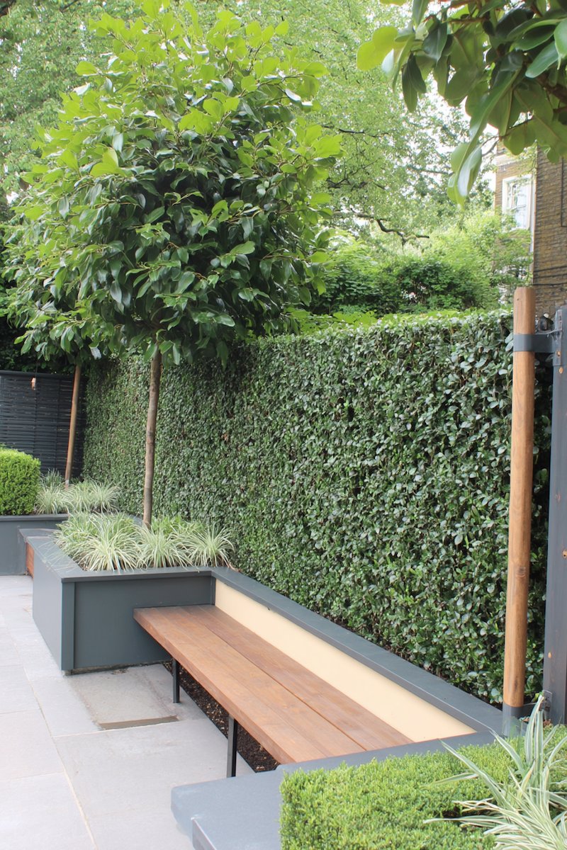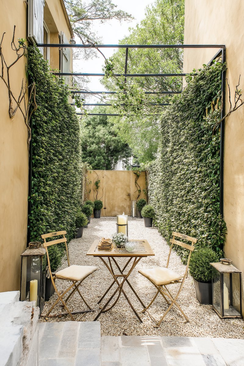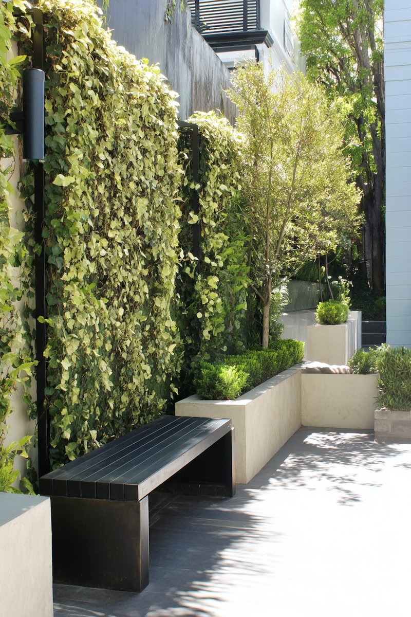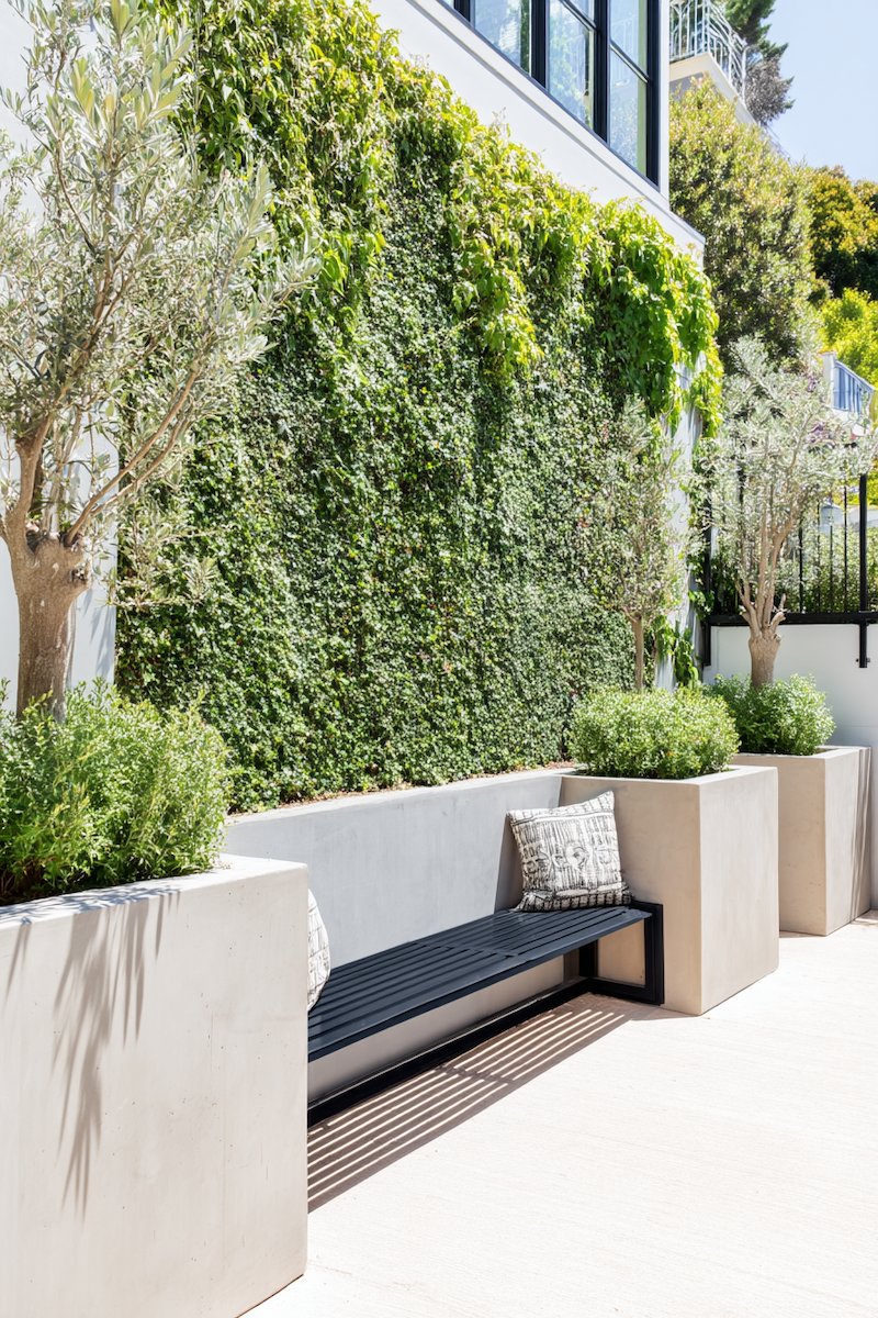 The lush green wall, adorned with trailing vines like ivy, creates a refreshing backdrop while providing privacy and tranquility. Incorporating low-maintenance plants such as boxwood and a sleek bench encourages relaxation and invites you to enjoy your outdoor space.