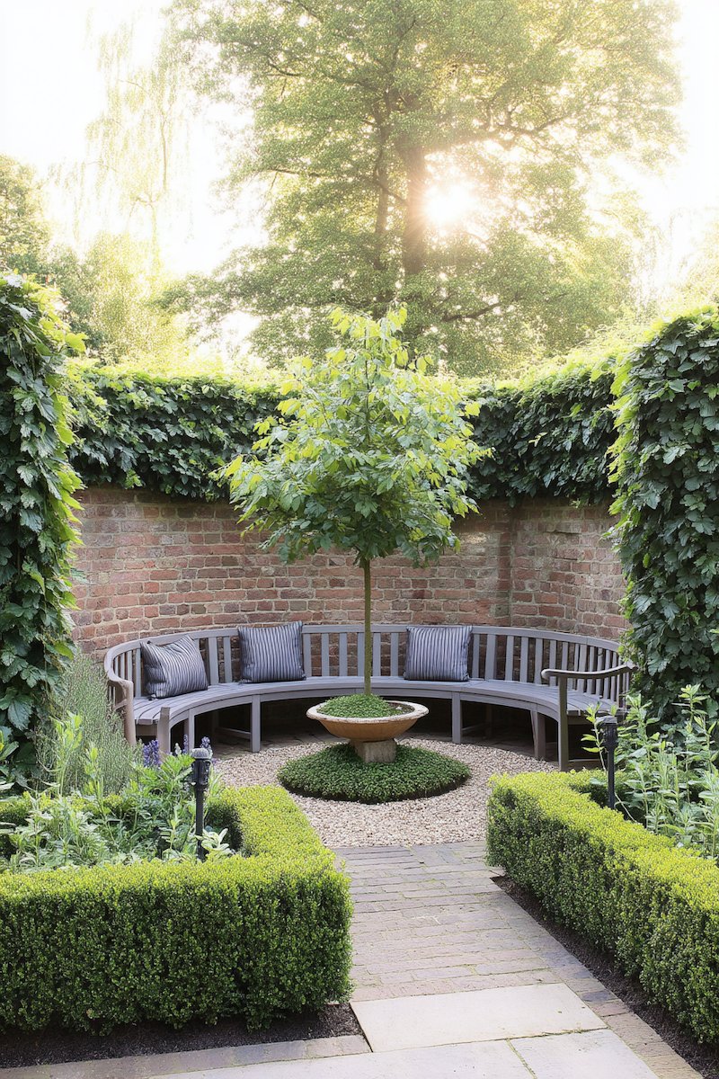 This garden design features a harmonious blend of circular seating and lush greenery, perfect for intimate gatherings. To replicate this look, incorporate boxwood hedges and a central tree for structure, while using natural stone for pathways.