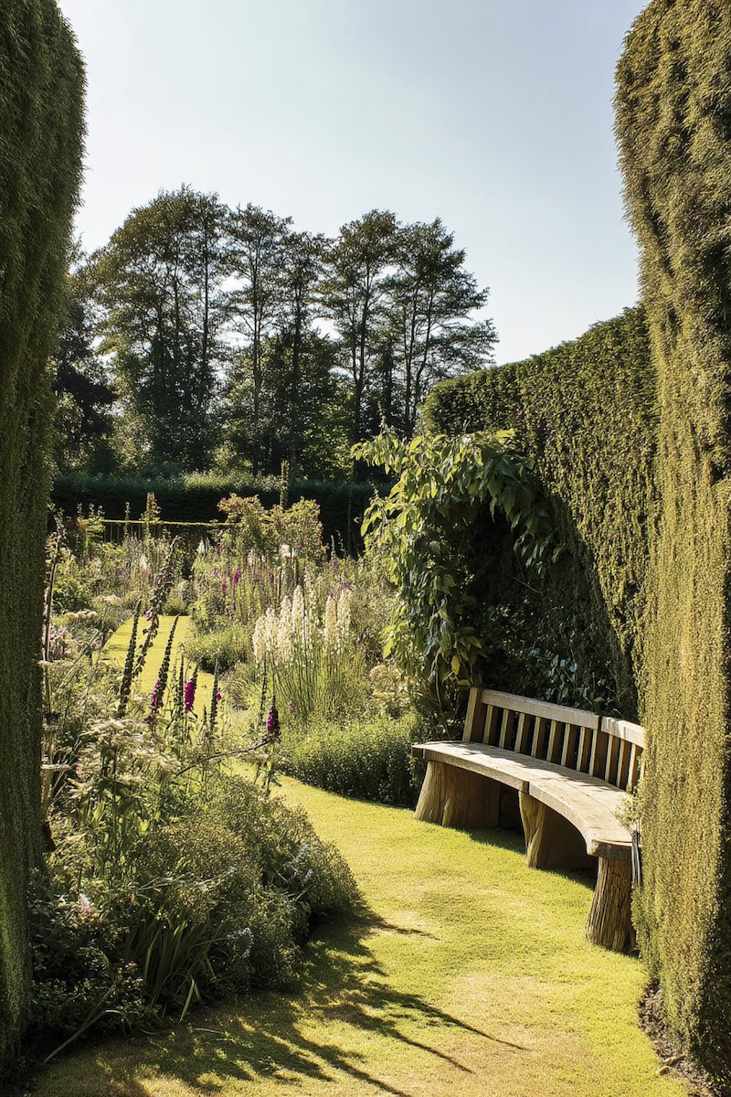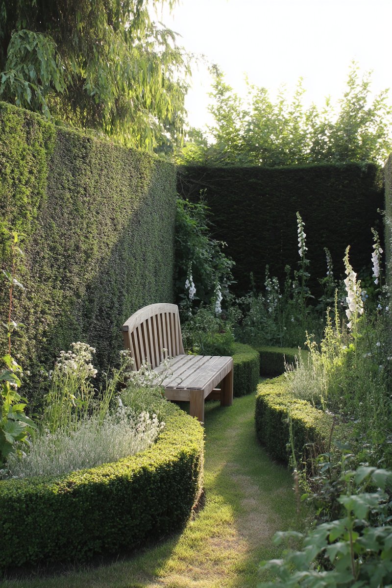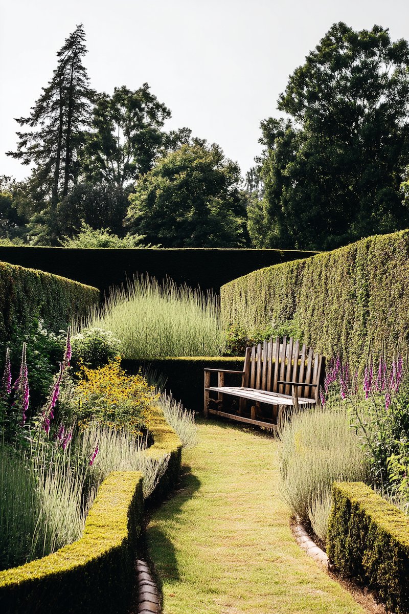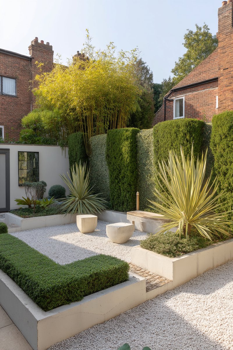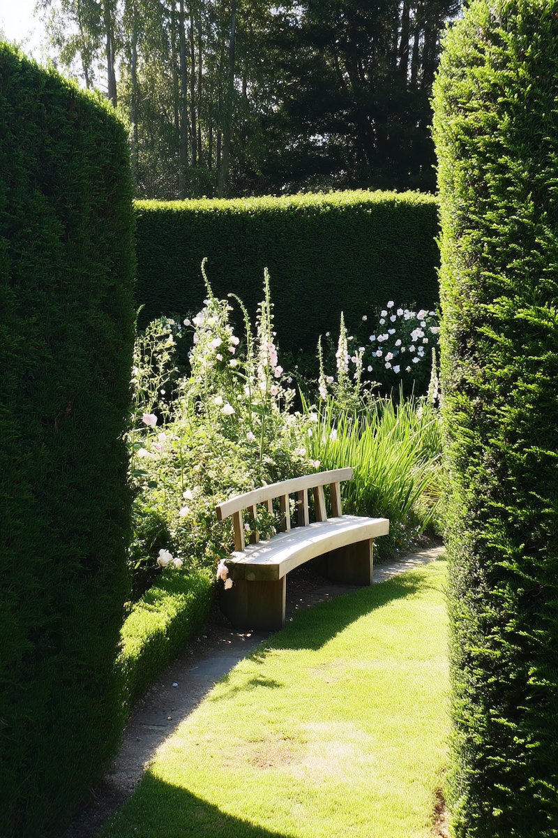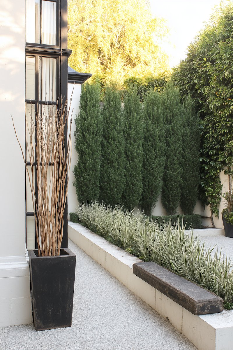 This design features tall, dense evergreen hedges that provide a striking vertical element, complemented by soft, low-growing grasses for texture. To replicate this look, choose hardy evergreens like Thuja or Cypress and pair them with ornamental grasses such as Blue Fescue for a minimalist aesthetic.