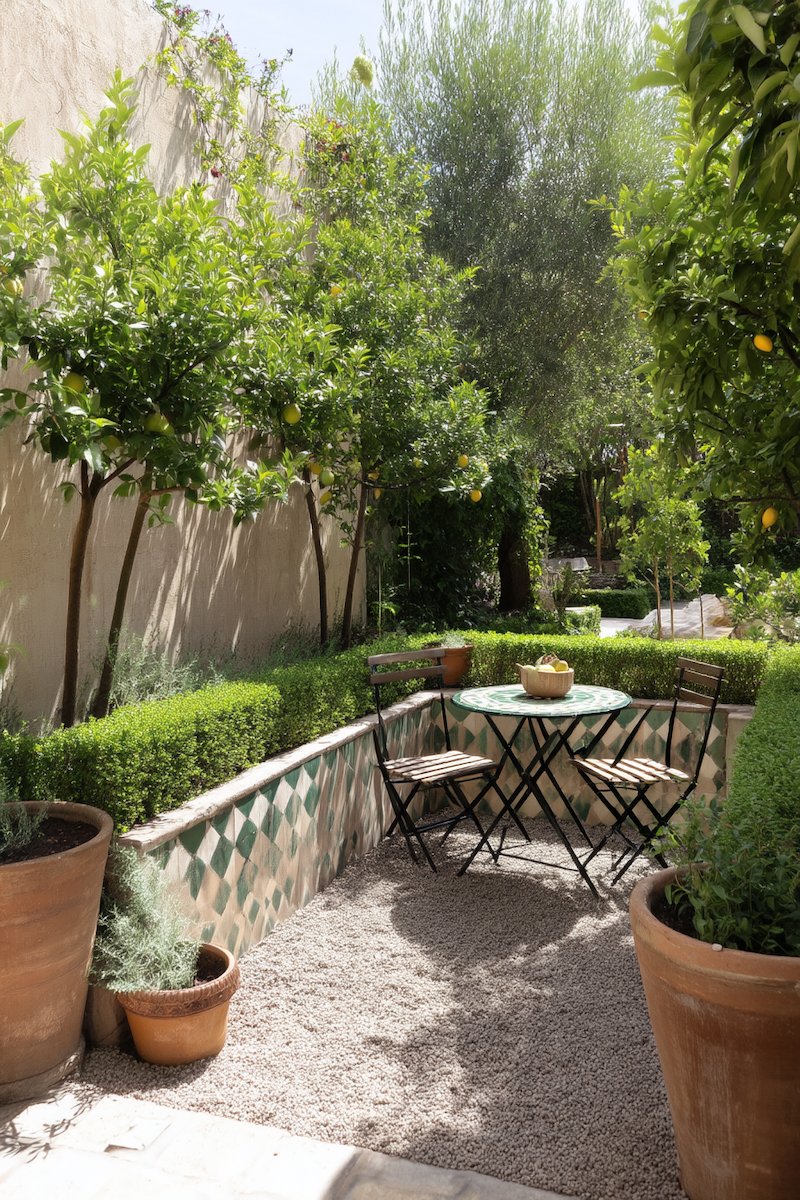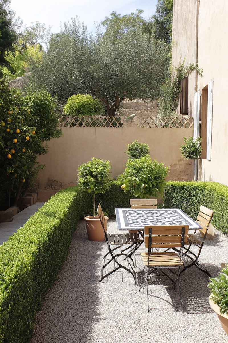 The charming combination of citrus trees and neatly trimmed hedges creates a vibrant yet serene outdoor space, perfect for relaxation. Incorporate gravel pathways and a mosaic table to enhance the feel while ensuring low-maintenance plants thrive in sunny spots.