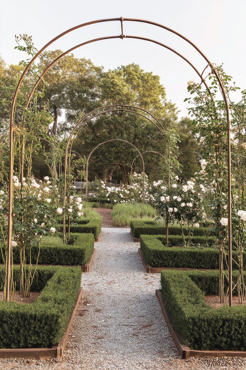 This enchanting garden features elegant climbing roses arching over a gravel pathway, creating a romantic and inviting atmosphere. To replicate this look, incorporate fragrant herbs like lavender alongside neatly trimmed boxwood hedges for structure and charm.