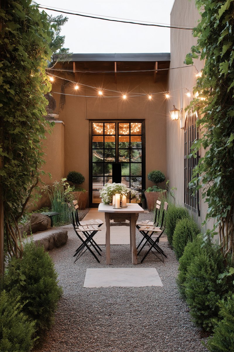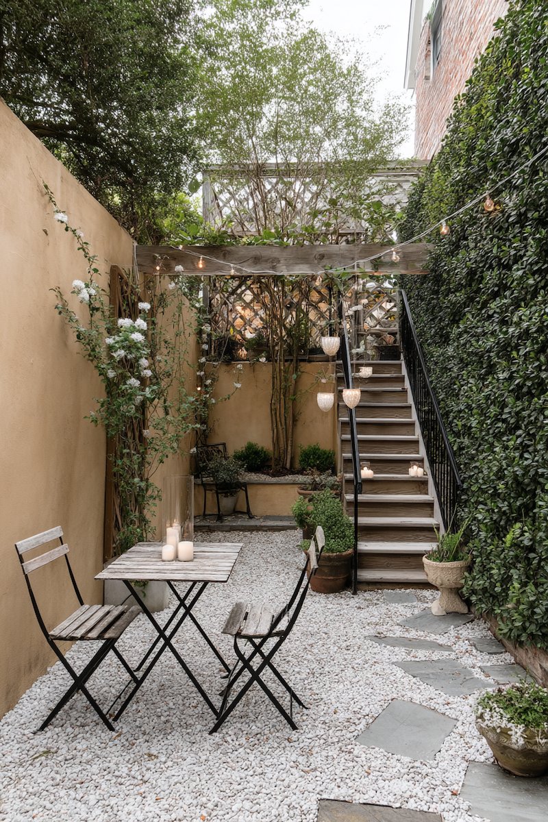 This cozy urban patio features lush greenery and delicate , creating a serene escape perfect for relaxation. Incorporate gravel pathways and string lights to enhance the inviting atmosphere and maximize small spaces.