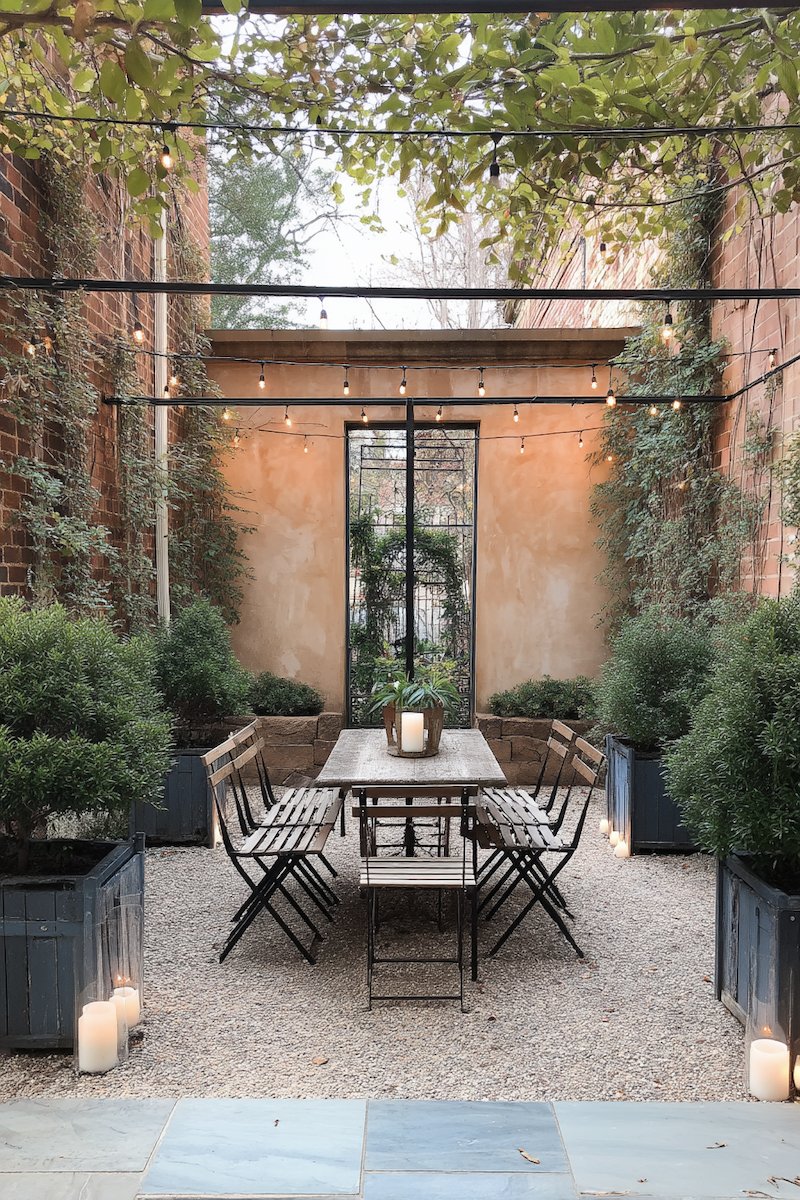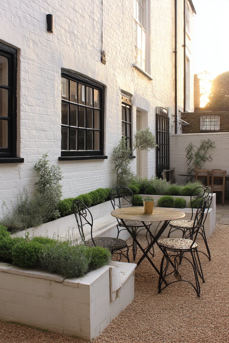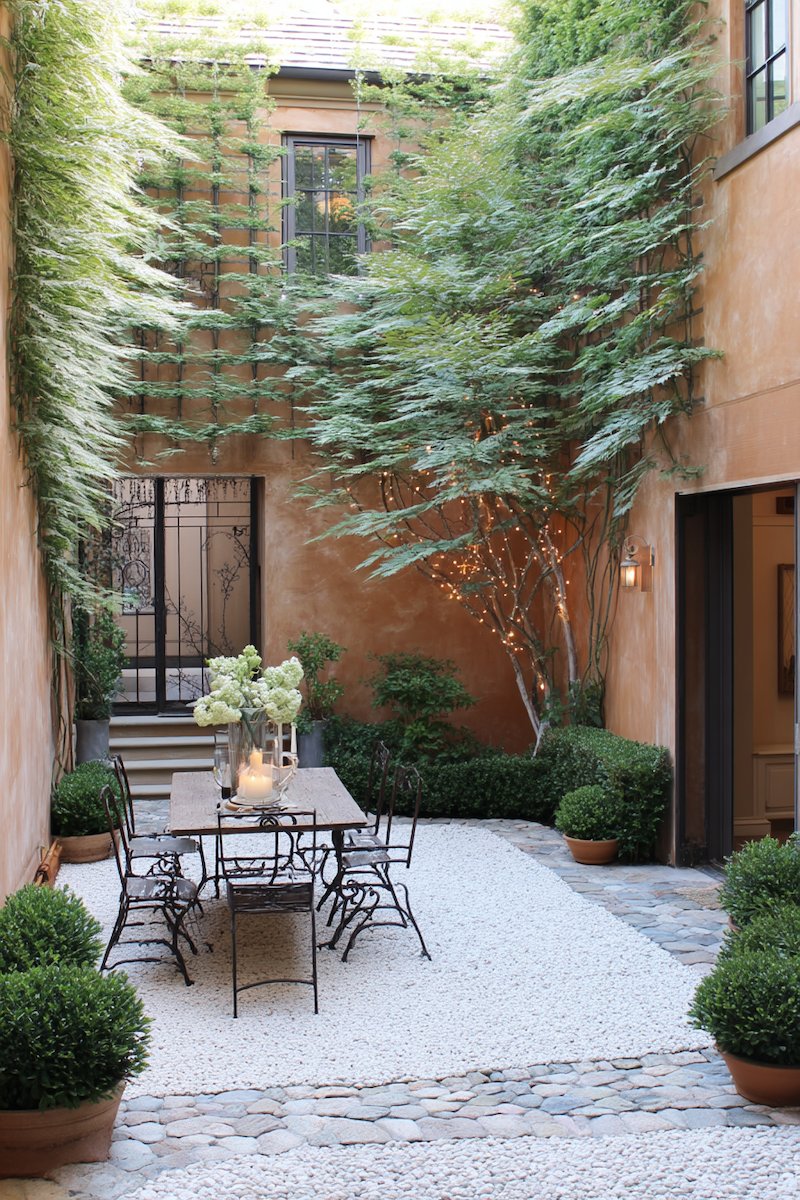 This contemporary courtyard features lush boxwood hedges that create a serene, structured environment, complemented by soft gravel pathways for easy maintenance. Incorporate classic metal furniture and subtle lighting to enhance the inviting atmosphere, perfect for cozy gatherings.