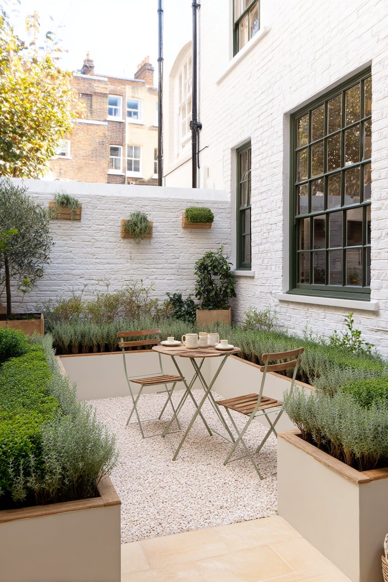 The sleek white walls contrast beautifully with lush herbs like lavender and thyme, creating a serene, modern ambiance. To replicate this look, incorporate low-maintenance planters and a cozy seating area for a charming retreat.