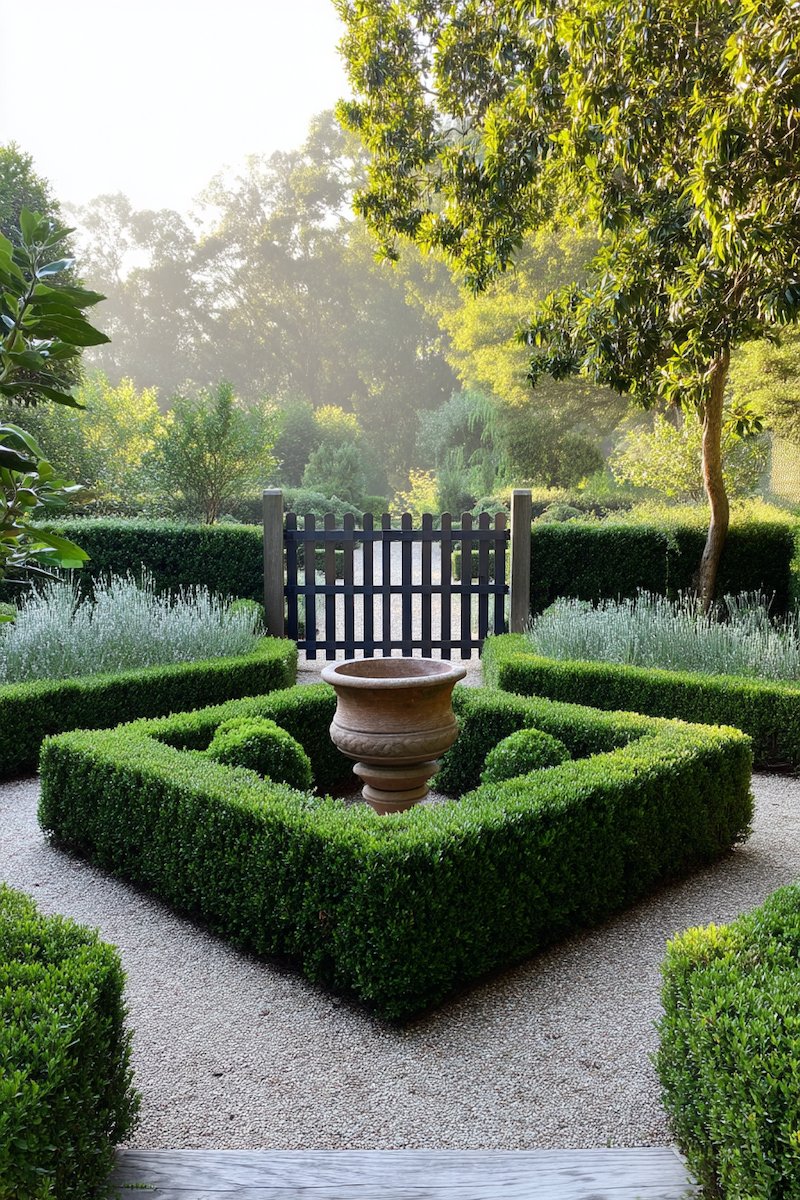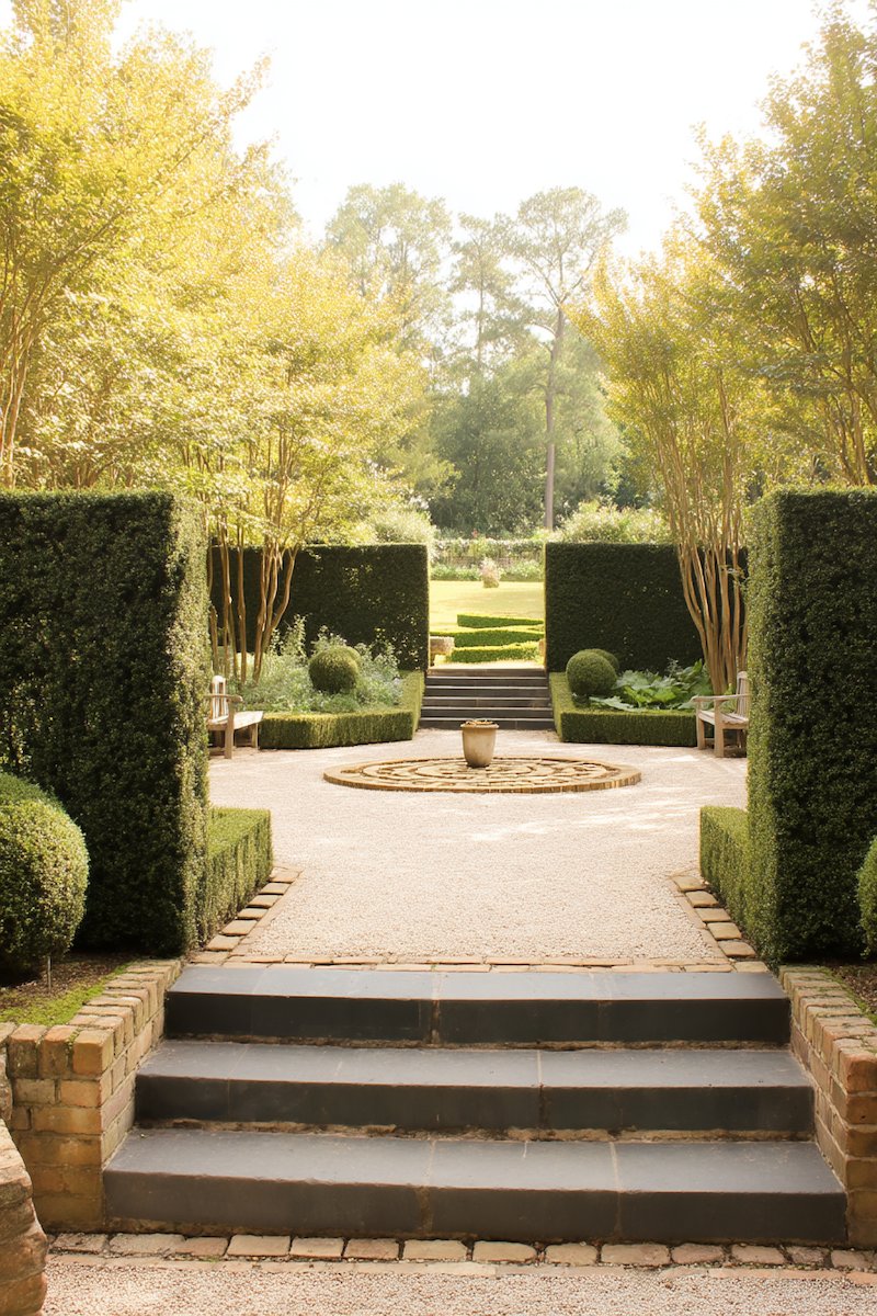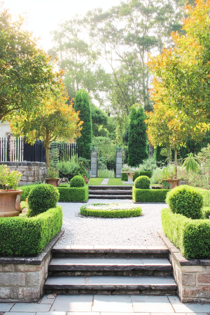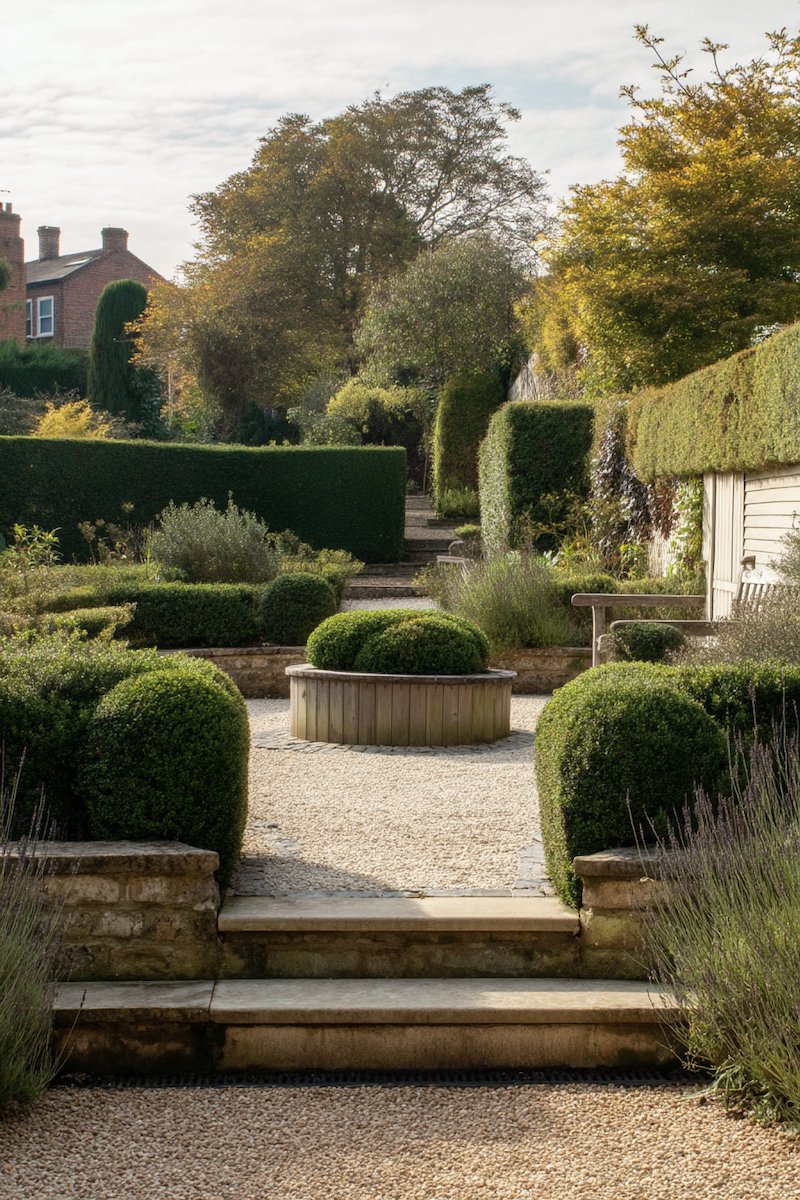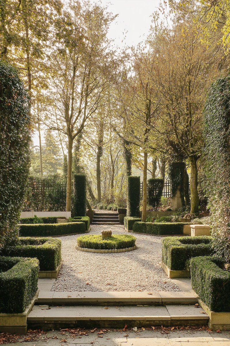 The elegant symmetry created by boxwood hedges and neatly trimmed topiaries invites tranquility, while the gravel pathways enhance the garden’s refined charm. Incorporate circular motifs with stone features to add a focal point, and consider layering plants for visual depth and interest.