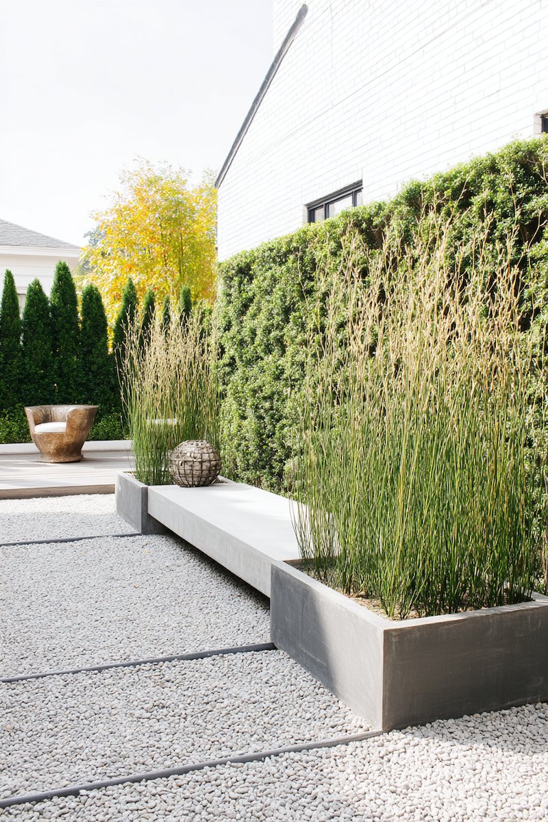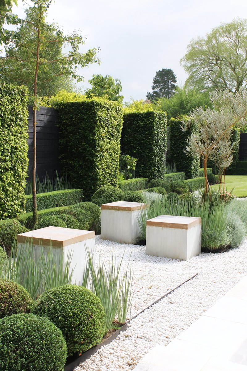The sleek lines of boxwood hedges paired with minimalist concrete seating create a serene and structured outdoor space. To replicate this look, use low-maintenance plants like lavender and ornamental grasses for texture and contrast.