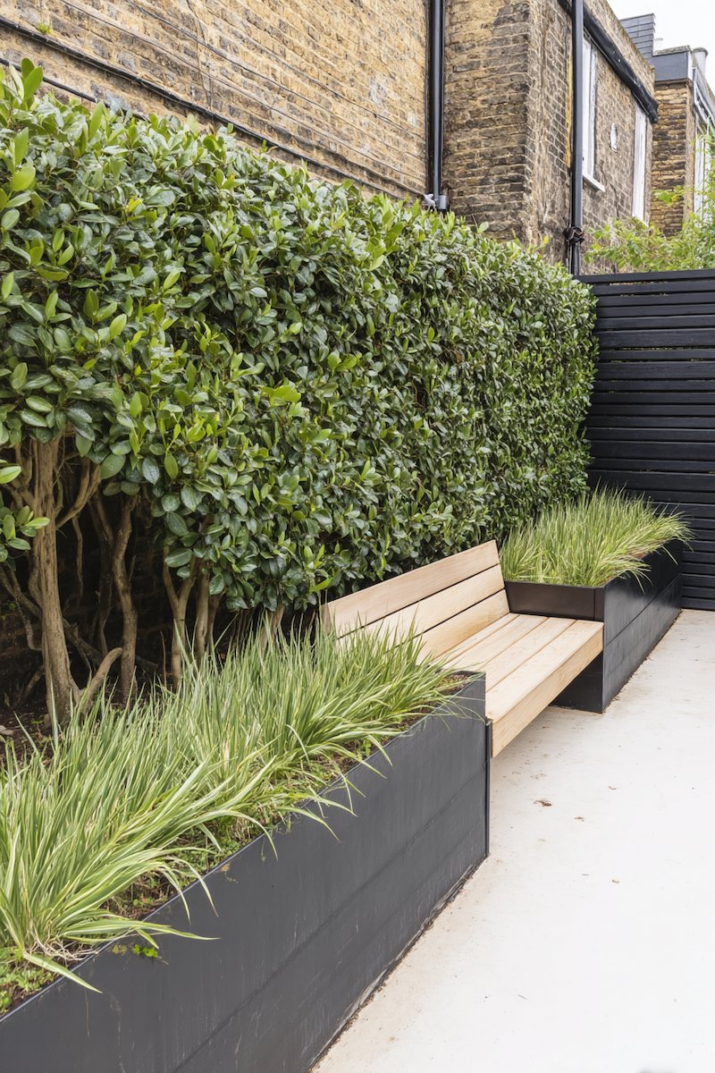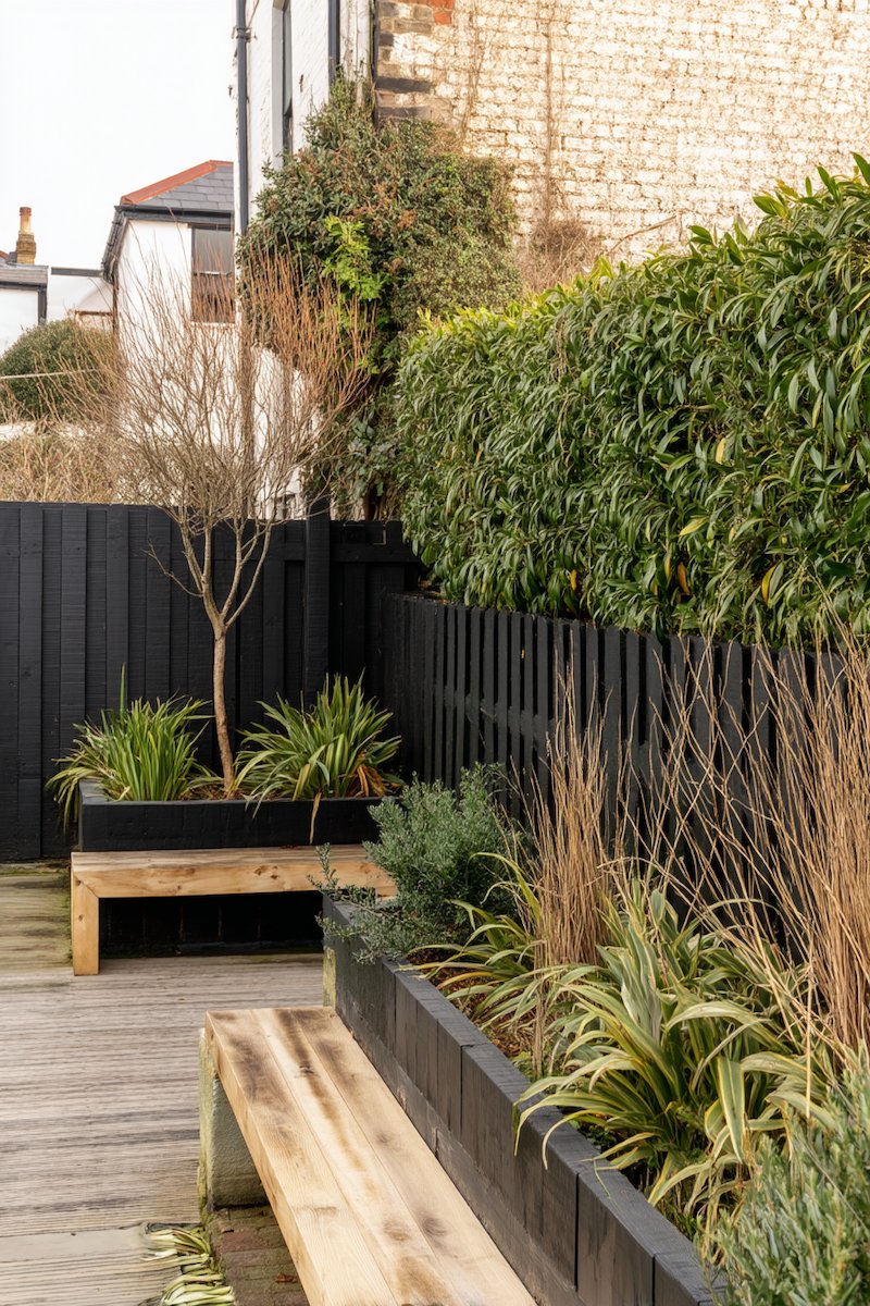 The sleek wooden seating contrasts beautifully with the dark, textured planters, while the soft greenery of herbs and ornamental grasses adds a touch of life. To replicate this look, choose low-maintenance plants like lavender and incorporate clean lines in your seating design for a minimalist aesthetic.