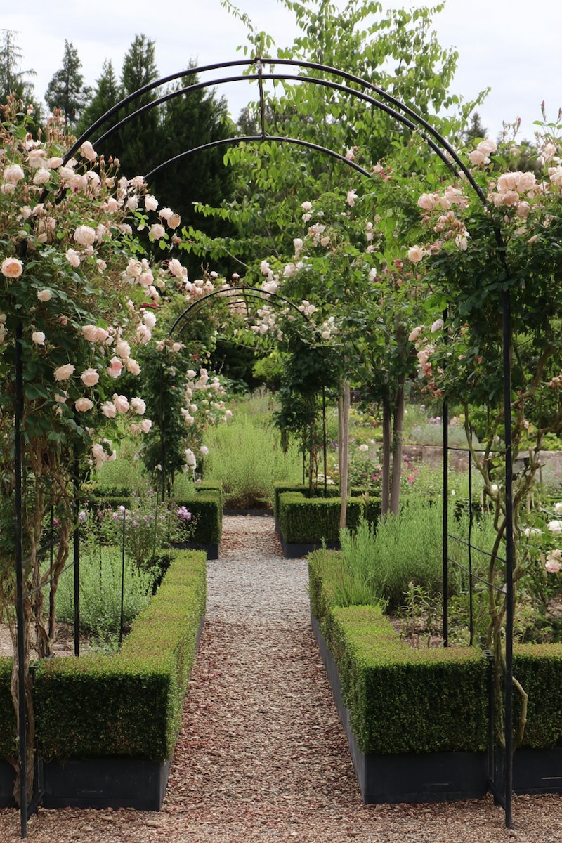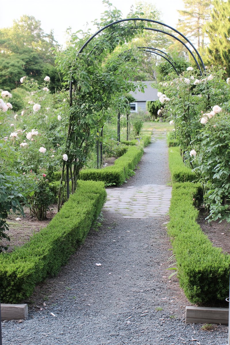The enchanting pathway framed by lush boxwood hedges and delicate climbing roses creates a serene and romantic atmosphere. To replicate this look, consider using a mix of perennial roses and neatly trimmed hedges for structure and elegance.