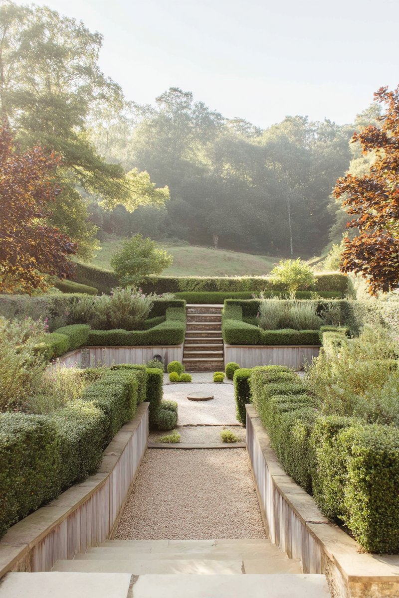 The meticulous symmetry of boxwood hedges creates an elegant backdrop, while gravel pathways invite leisurely strolls through this serene oasis. For a similar effect, consider using compact evergreen plants and incorporating structured pathways to enhance visual interest and accessibility.