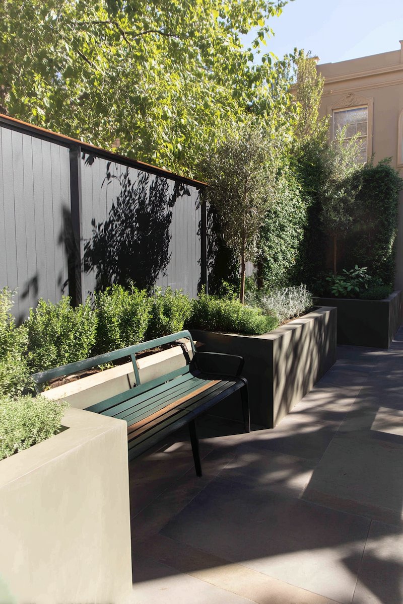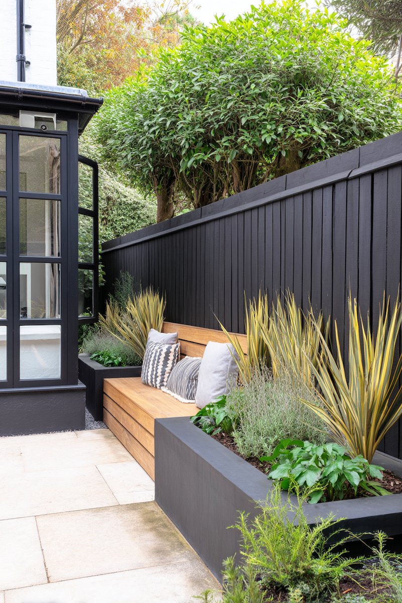 The striking contrast of the black fencing against lush greenery creates a sophisticated minimalist aesthetic, perfect for a contemporary space. Incorporate low-maintenance plants like ornamental grasses and evergreens for year-round interest while using clean lines for furniture and planters to enhance the design.