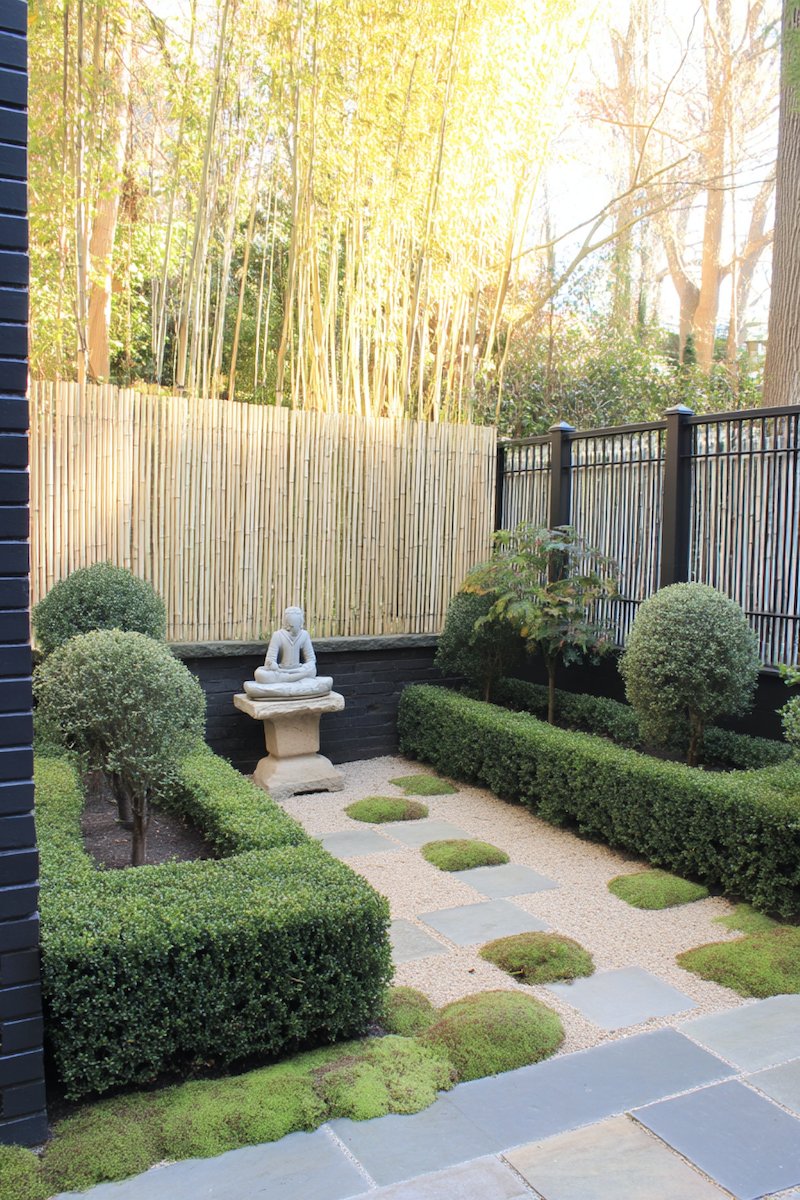 This serene garden features lush bamboo for height, complemented by neatly clipped boxwood hedges and soft moss patches that invite tranquility. To recreate this look, combine evergreen plants with natural stone pathways and a focal point like a stone statue to enhance the peaceful atmosphere.