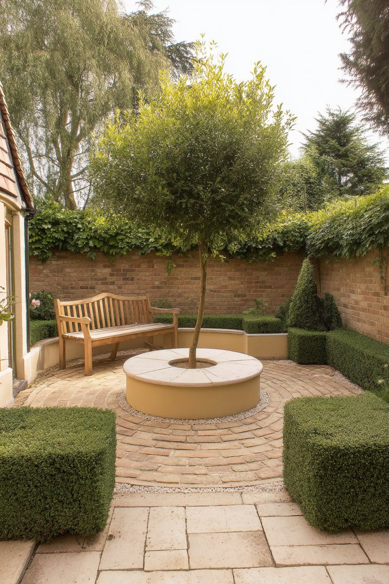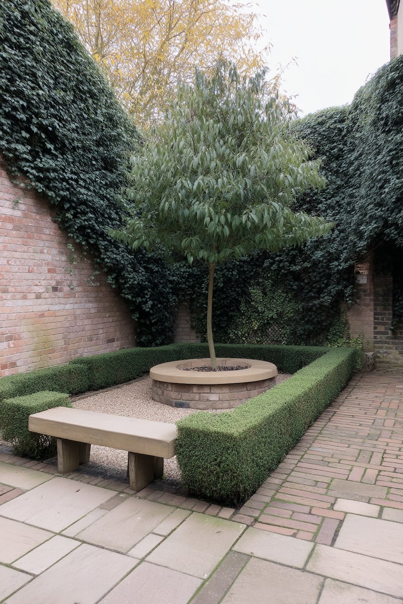 This design features a central tree surrounded by neatly trimmed hedges, creating a serene focal point in a minimalist setting. To replicate this look, consider using a small ornamental tree and low-maintenance boxwood for a clean, contemporary feel.